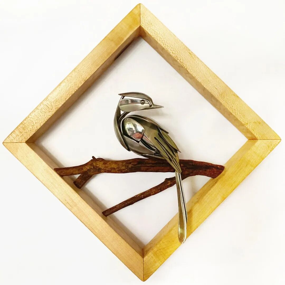 这些利用废弃餐具制作的鸟类雕塑作品,在制作完成后,还被马特·威尔森摆放到他收集到的废弃木框里,整件作品好像一幅画,完全由废弃材料制作而成,而这些由废弃材料制作的雕塑作品,比用新材料制作的作品更加精彩,更富有意义和价值。