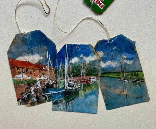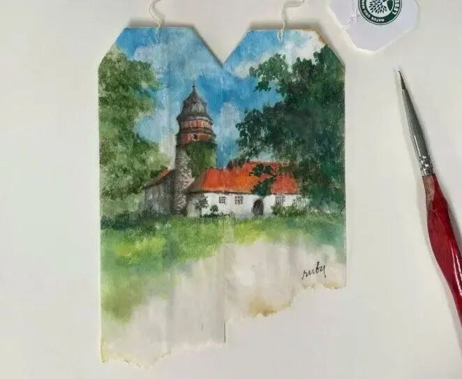 就是这样一个被人们随手丢弃的二手茶包,在这位茶包画家手里创造出让人惊叹的价值,在漫长的时间里,她的茶包画作越来越精彩,绘制在这些茶包上的主题,也大多来自这位画家的见闻,她喜欢将旅游途中的景色用茶包画记录下来,这样一来让她的画作内容变得十分丰富。