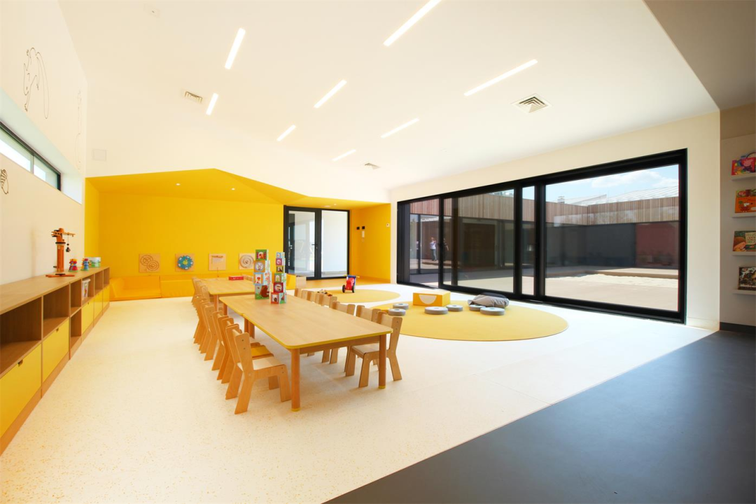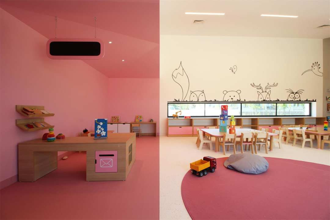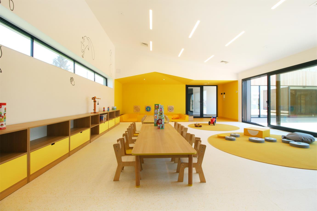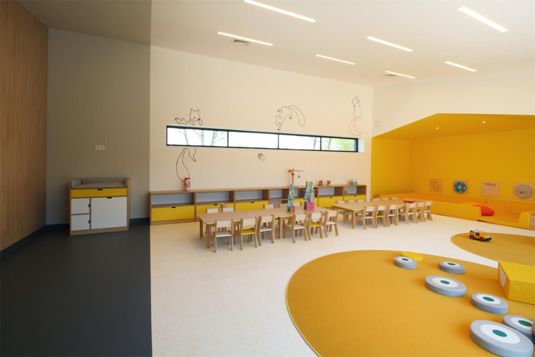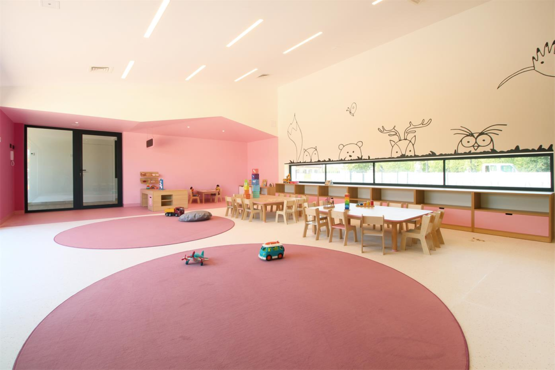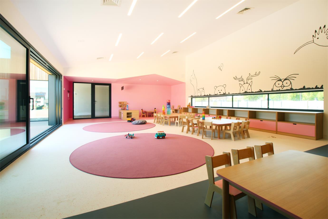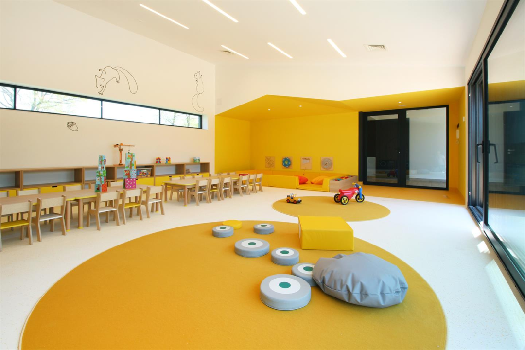 建筑的入口位于北面,主大厅通过游戏室、行政空间和衣帽间,从衣帽间,孩子们可以进入教室,每个教室都有一个宽敞的卫生间和小储藏室,每组教室分别使用了粉色和黄色,色彩的区别加强了孩子们对于房间的认识。