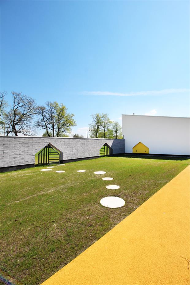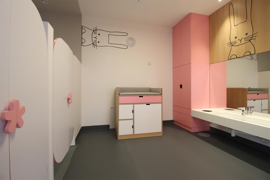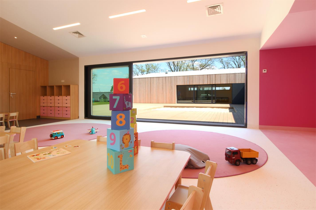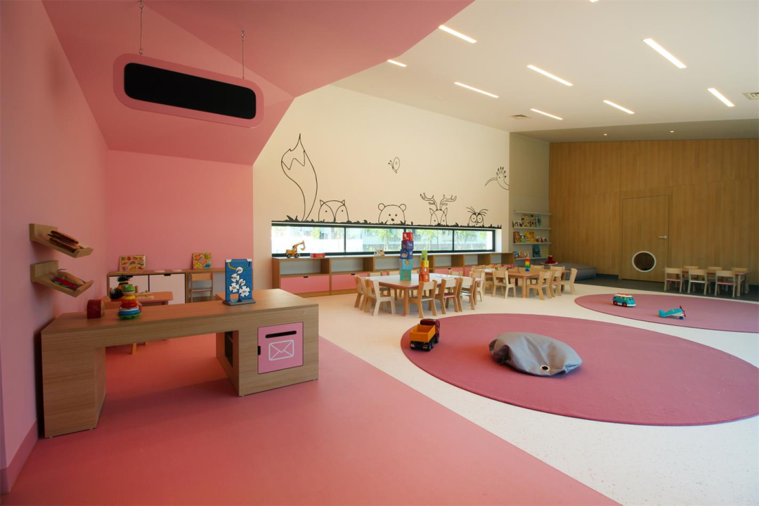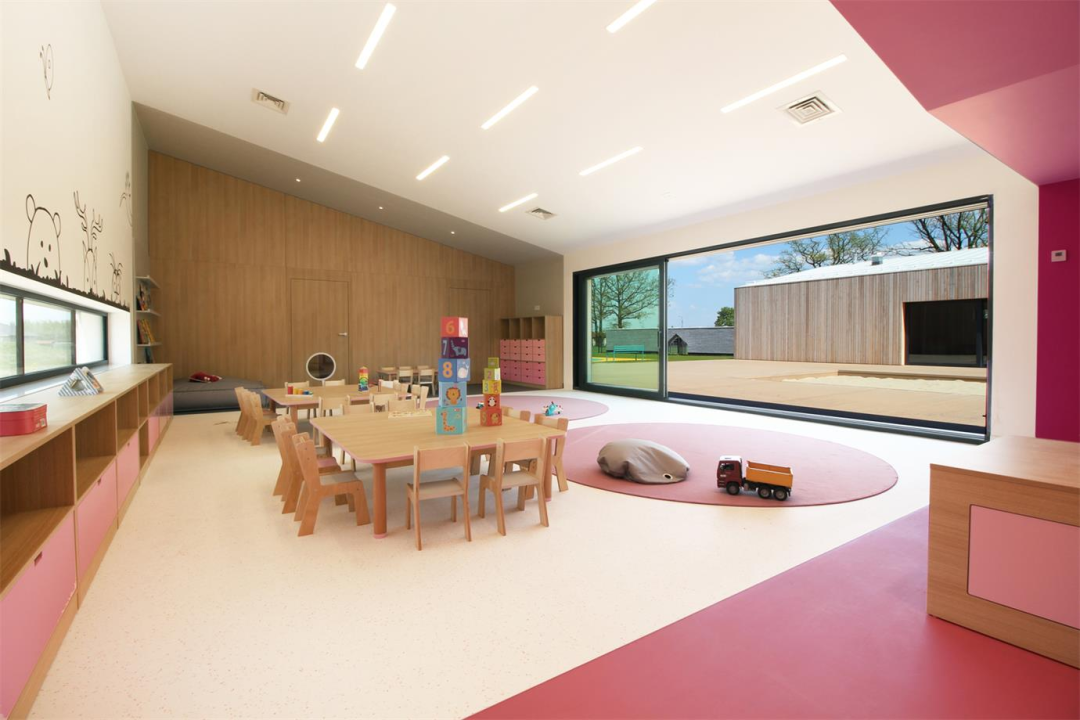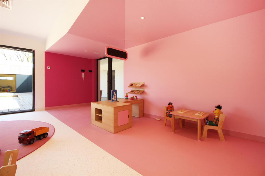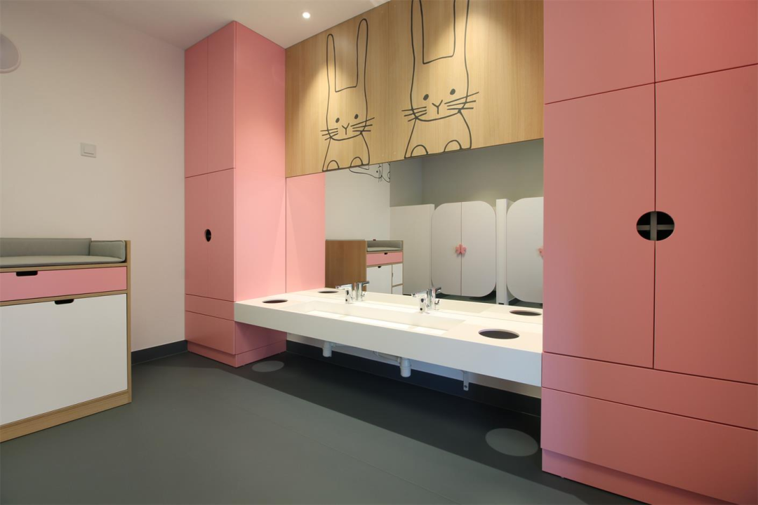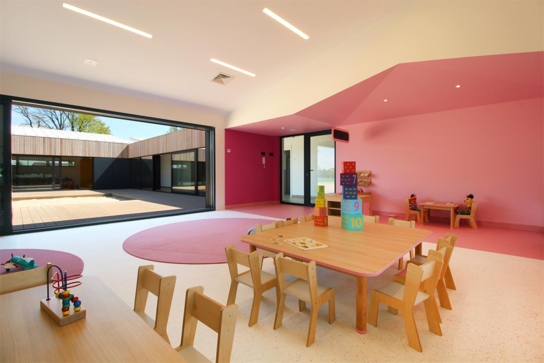 建筑的入口位于北面,主大厅通过游戏室、行政空间和衣帽间,从衣帽间,孩子们可以进入教室,每个教室都有一个宽敞的卫生间和小储藏室,每组教室分别使用了粉色和黄色,色彩的区别加强了孩子们对于房间的认识。