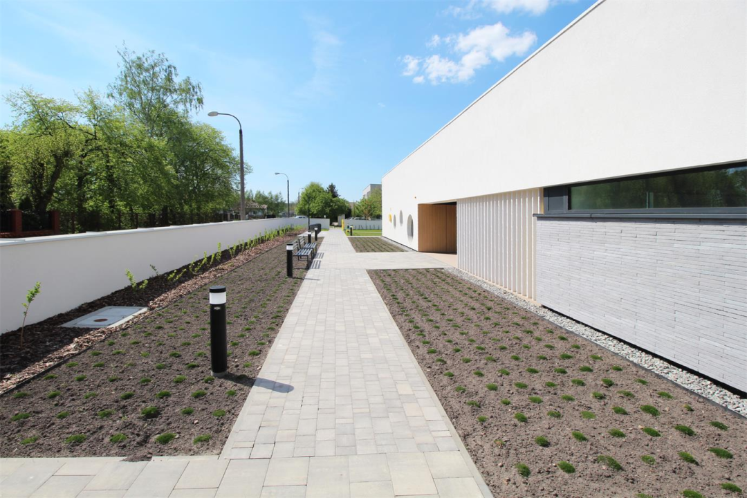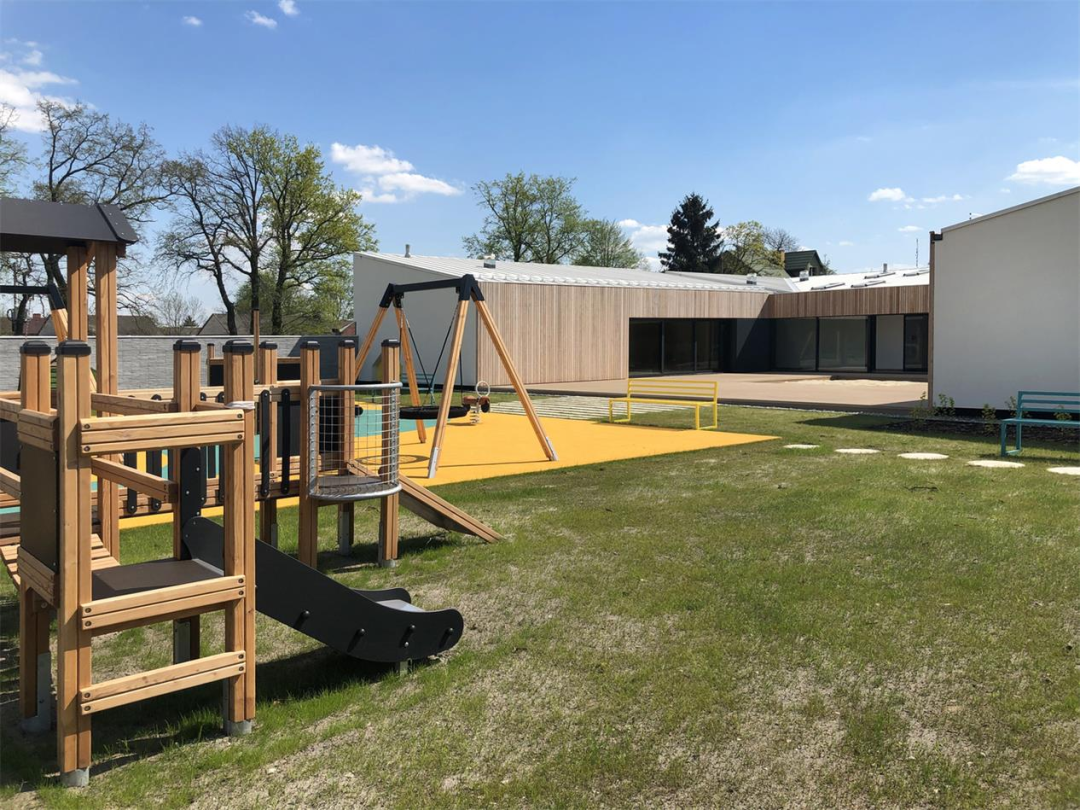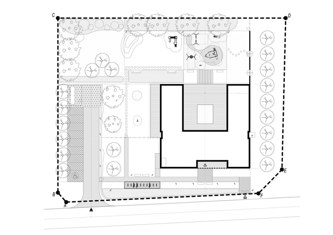 建筑呈马蹄形,中央有一个大露台,虽然朝南但在建筑的阴影下,孩子们也可以安全地玩耍。操场是露台的延伸,所有的区域都种植了果树和灌木,未来这些区域会长满绿色的植物。