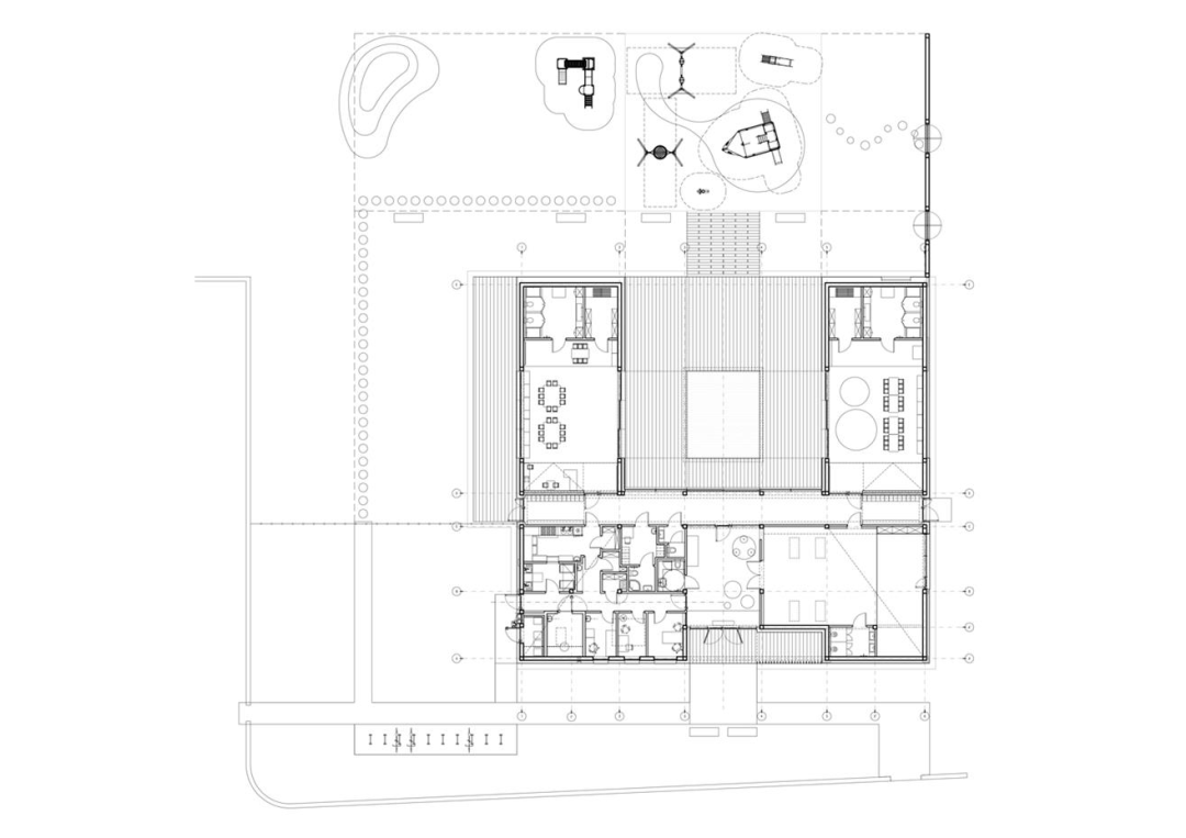 整个建筑由两个小组房间和一个游戏室组成,游戏室有一个一个单独的入口和厕所,不仅可以用于幼儿感官整合和体育活动,当地社区还可以使用它来组织小型活动或市政会议,游戏室的功能会根据需求进行动态调整。