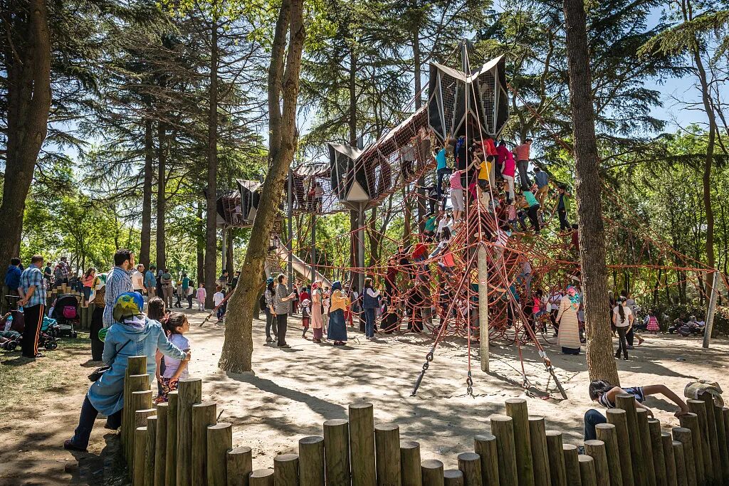 场地现状地形位于一个陡坡之上,上下高差相差14米,这本来是一个比较棘手的问题,但是设计师利用奇思妙想,在尊重场地现状的情况下,将现状山体规划为三个主要平台和两个坡地,一个大于60度陡坡为大孩所用,一个小于30度缓坡为小孩所用。这样不仅解决了场地中的高差问题,也利用地势打造适宜不同年龄段的活动空间,将孩子们分开游玩,让他们感受与同龄人尽情玩耍的快乐,场地当中的三个平台和两个缓坡还根据年龄分段,保证每个年龄段的孩子都可以游玩使用到。