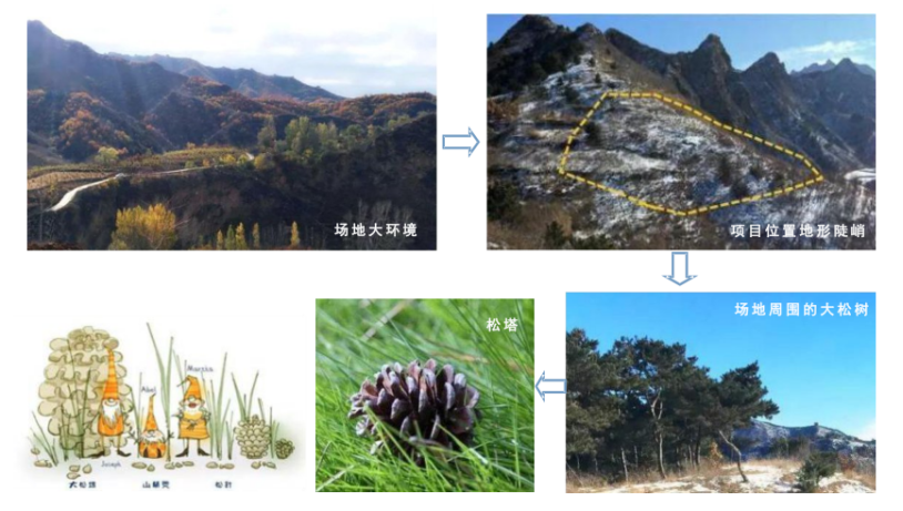 项目设计理念来源于场地周围种植的大量松树,大松树周围铺满了许多成熟落地的松塔。设计师充分考虑儿童的心理需求,将松塔这一具象的物体作为主题,编写了充满童话趣味的故事——“松塔奇遇记”。