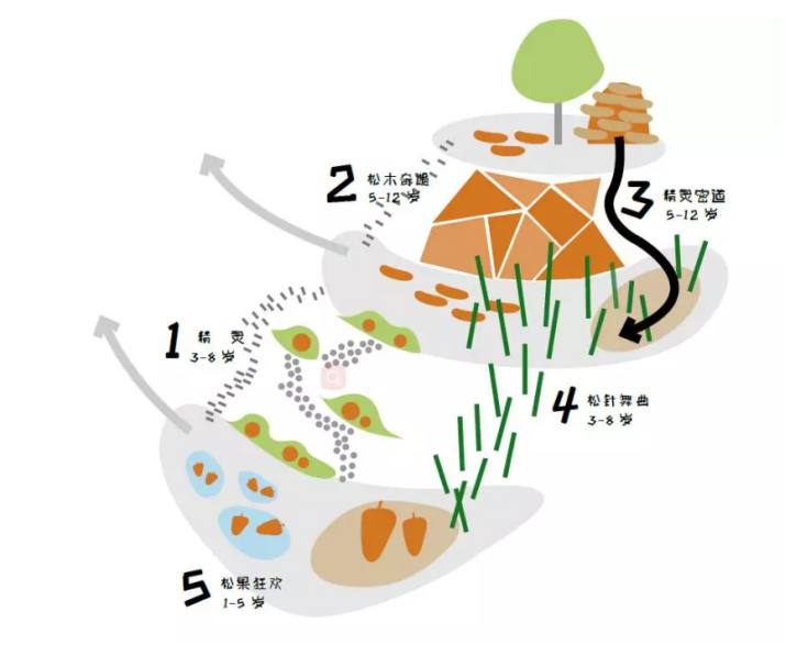 “松塔奇遇记”以故事内容串联各个场地,通过设计的手法巧妙地将孩子们意识里的世界与现实世界转换。小精灵们从淹没在山体中的精灵屋出发,与松木奇遇,通过精灵密道完成场地情境的互换,共同见证“魔法奇迹”。“松果狂欢、松针舞曲”带领不同年龄段的孩子们在特定情境下肆意玩耍,通过五感感知,对松塔、松针等自然元素产生深层次认知,与大自然完成更加亲密的接触。