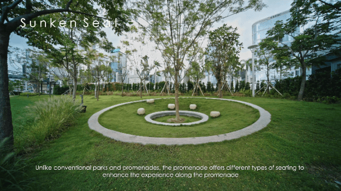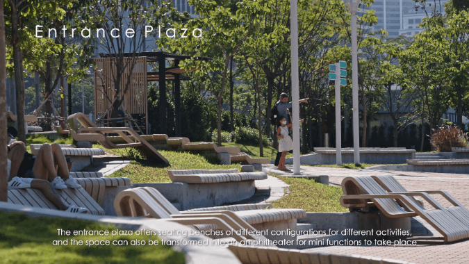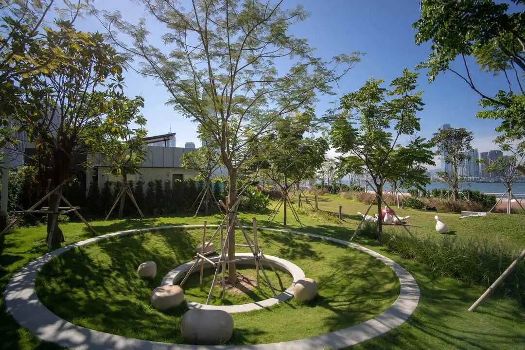 乐园内设有观景小丘,供三五知己共聚及观赏海景;连绵的绿化走廊,可让游人闲坐休息,亦可作表演或艺术活动空间。