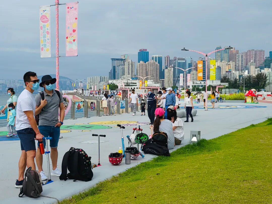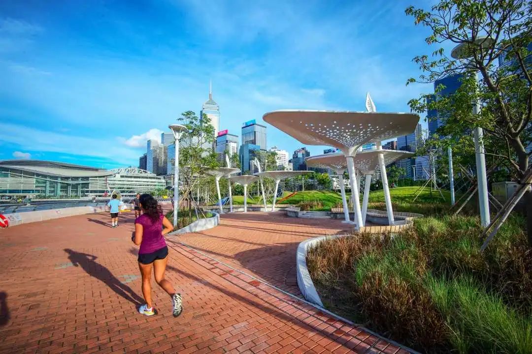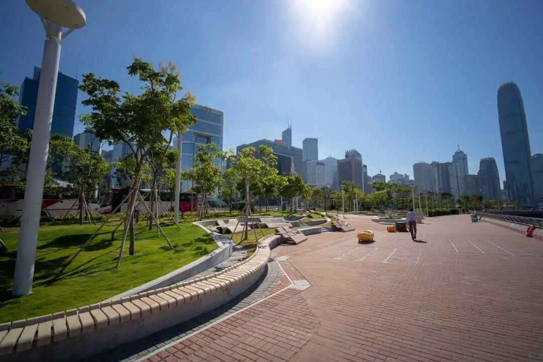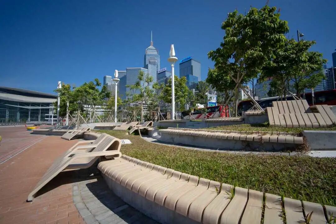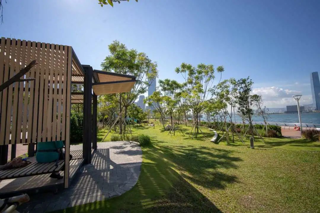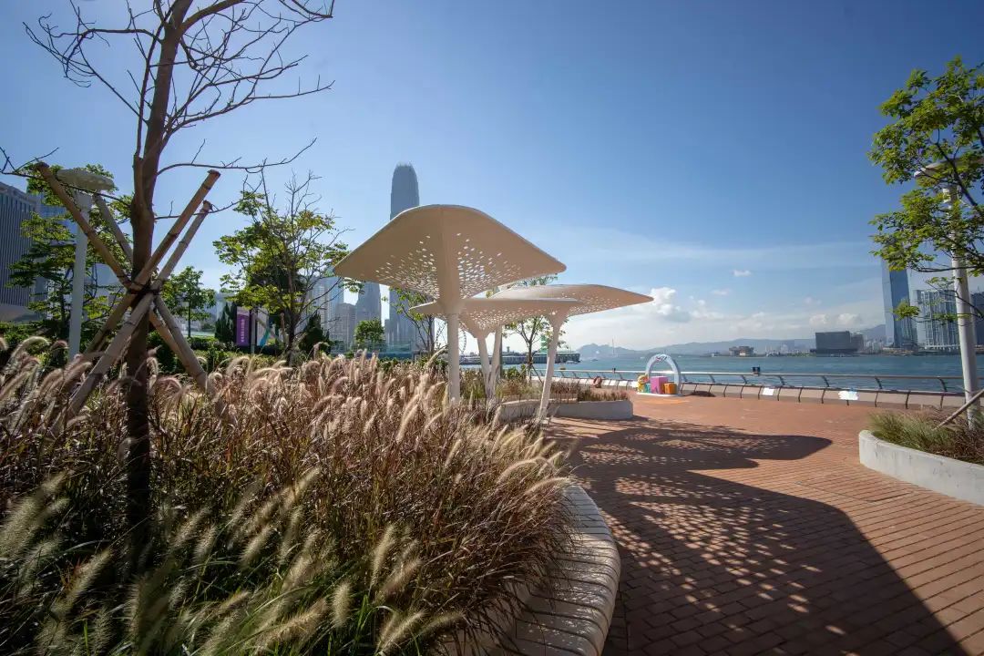 新开辟的湾仔海滨长廊空间面积约7800平方米,以草地为主,市民可漫步及耍乐,项目也提供多款凉亭、桌椅和观景小品,让游人在欣赏维多利亚港景色的同时于此放松身心。