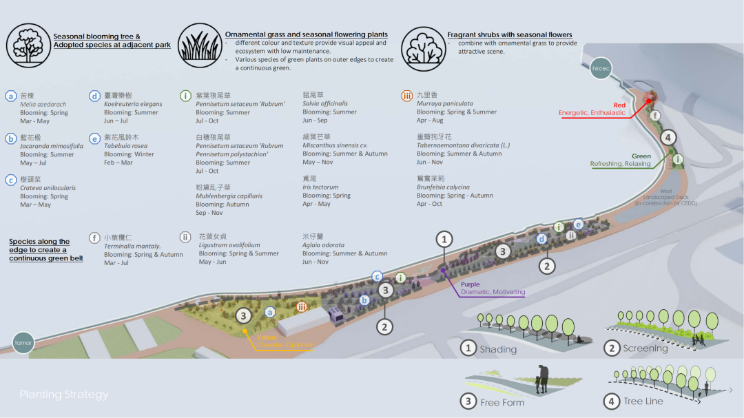 每段长廊的地理环境和市民的需求不尽相同,而设计的目的则在于基于场地环境赋予公共空间新的功能性与艺术观赏性,丰富当地物种多样性的同时,从根源性上改善环境并为市民缔造多姿多彩的海滨体验。