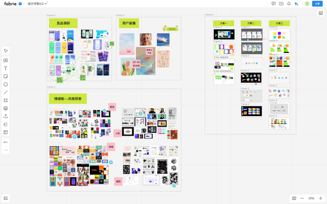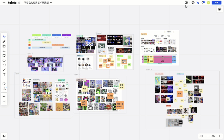 而当我们的工作都在Fabrie中发生。我们在这里做思考延展、做思维导图、做调研、做脑暴、做情绪板、做设计方案......那么这些资料和信息最后都会变成自然而成的演示文稿。