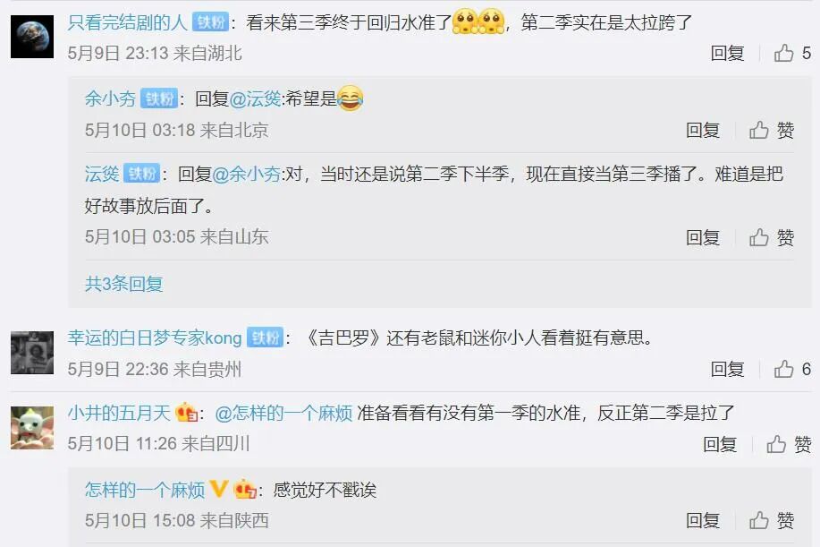 而第二季的评分则跳崖式下降,只有6.8分,网友普遍觉得相比第一季,第二季有点拉胯,亦对第三季的期待值有所下降。而此番第三季9集的全部上线能否拉回第二季造成的口碑下滑,咱们一起拭目以待吧!