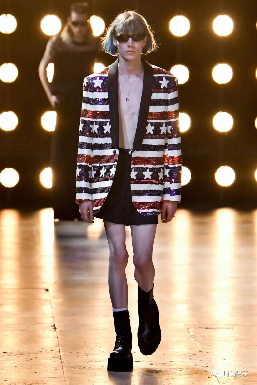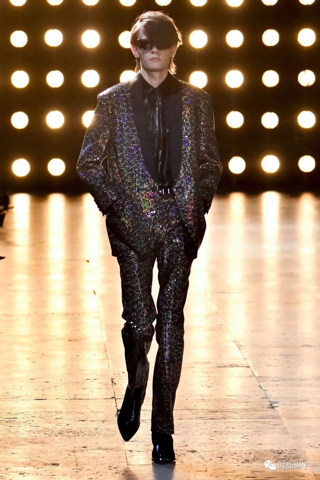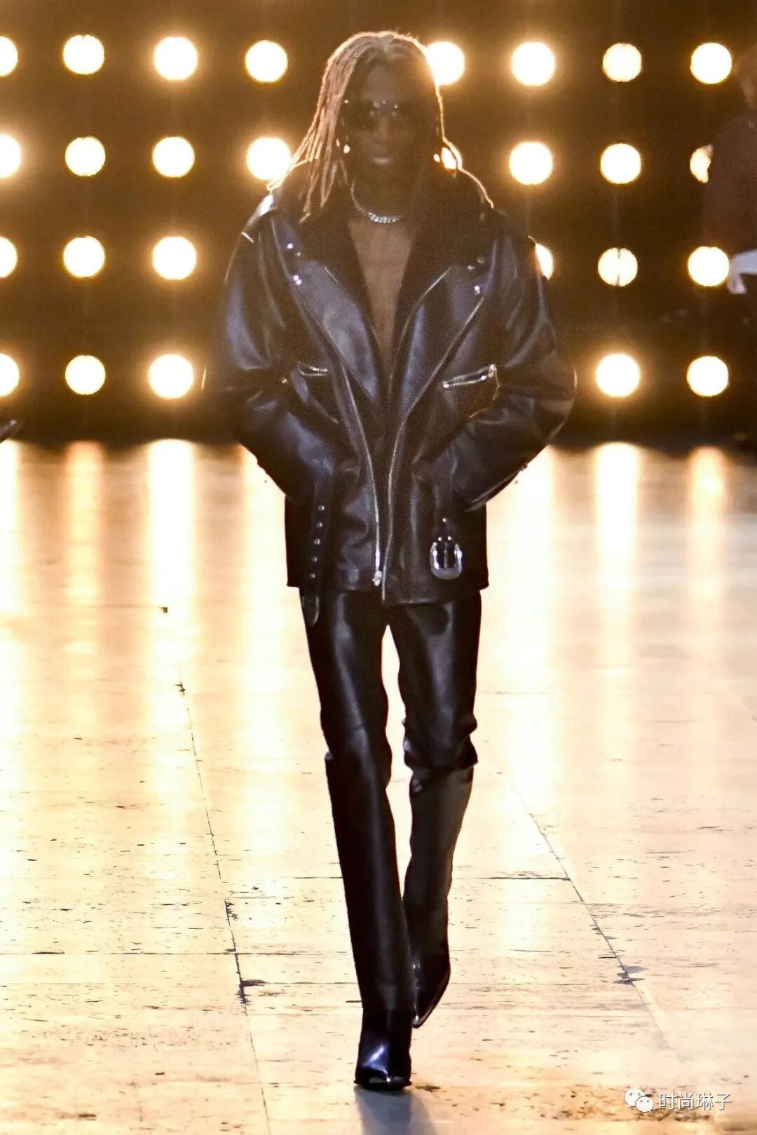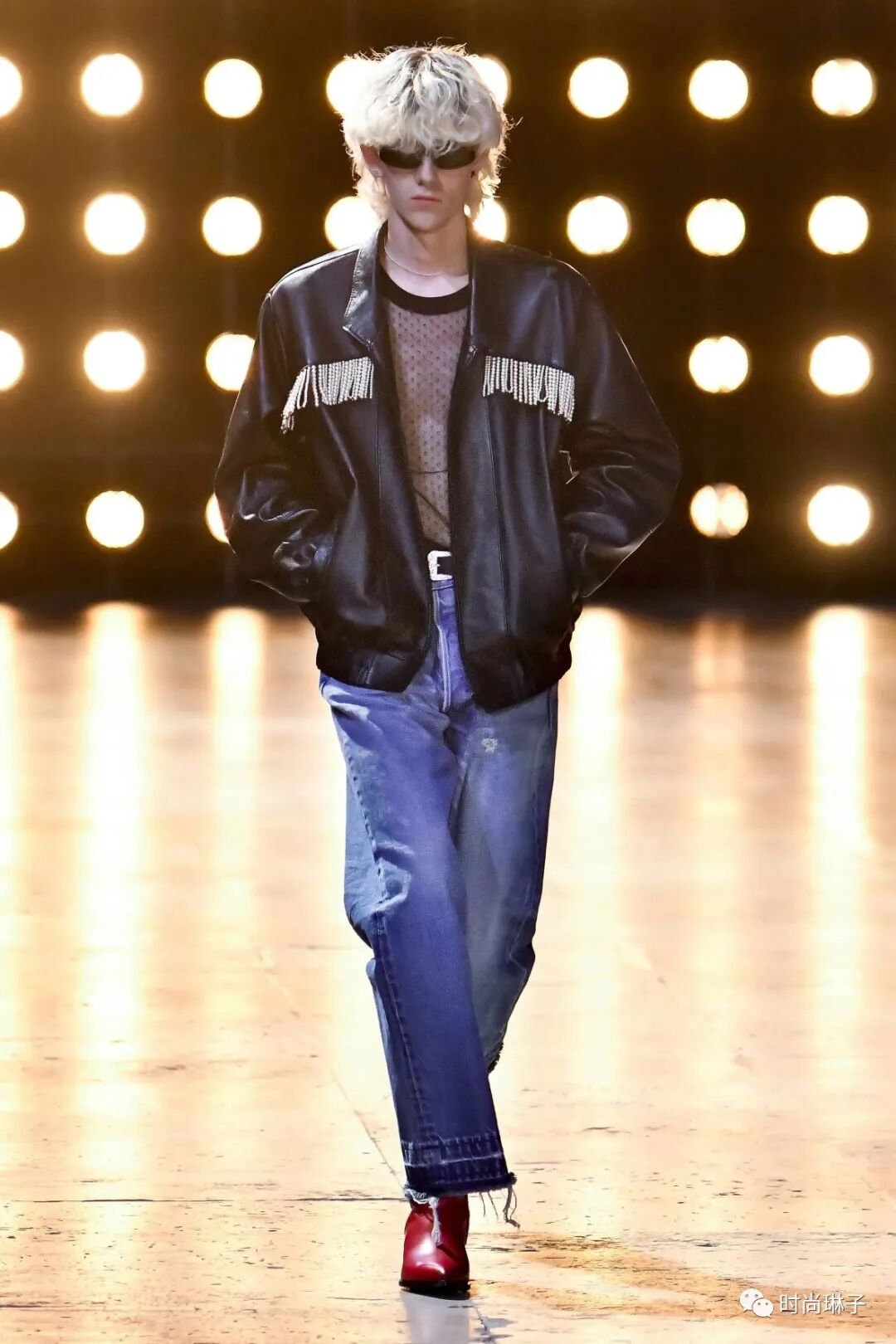 CELINE 2023春夏男装系列以OVERSIZE的外套为主,简约的廓形,搭配亮片流苏等华丽的细节设计,炫酷的短裤造型,摇滚范儿十足。