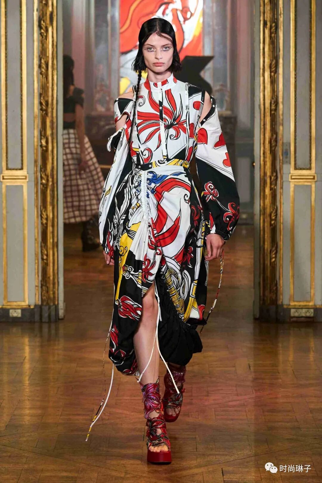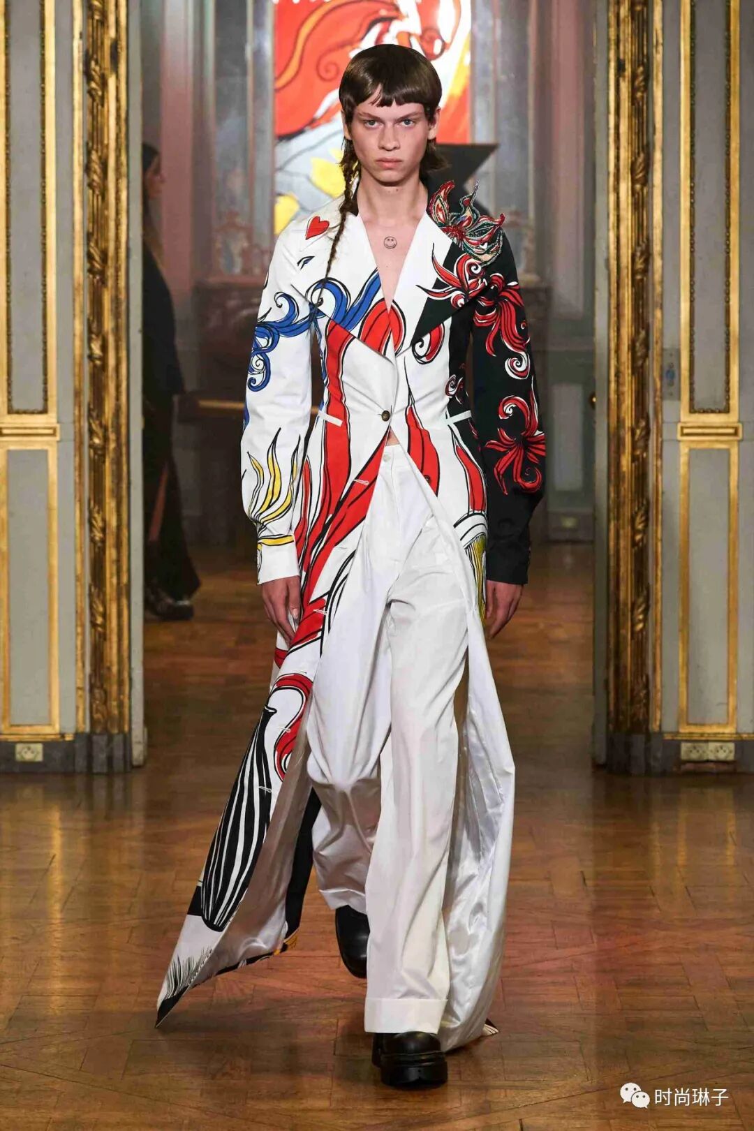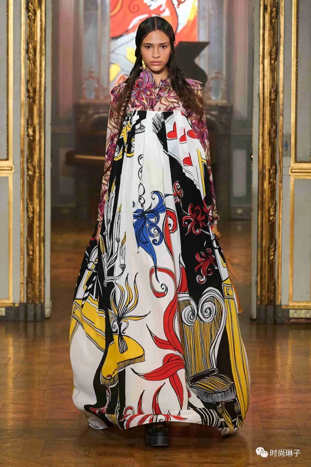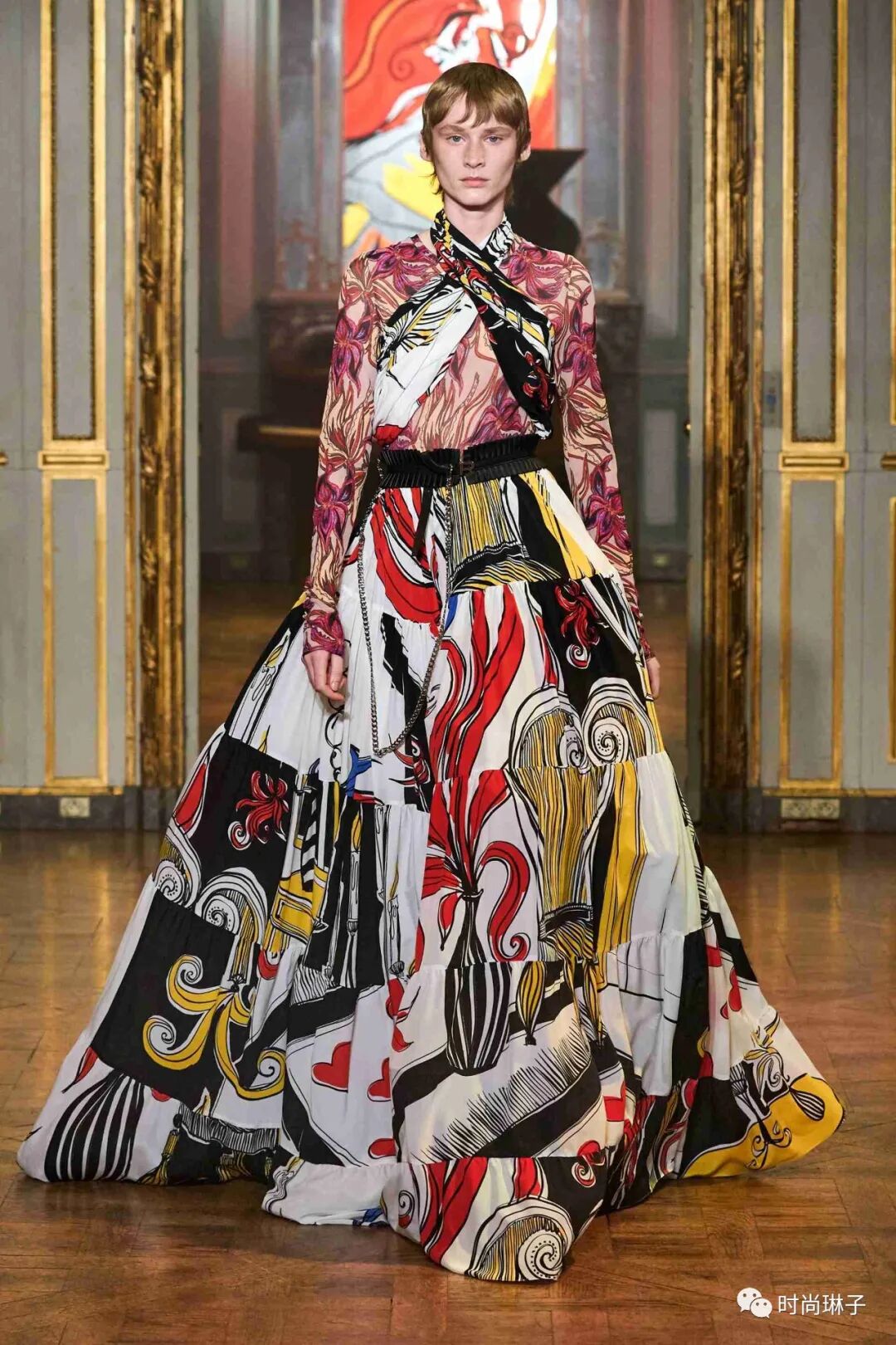 从迪奥到纪梵希,当下很流行将绘画艺术和时装相结合。该季的第二组造型将设计师的艺术作品转化为印花图案,和裁剪的连衣裙结合,尽管印花的颜色和风格与Charles De Vilmorin 一月份的个人高定系列非常接近,但十分时尚且个性鲜明。