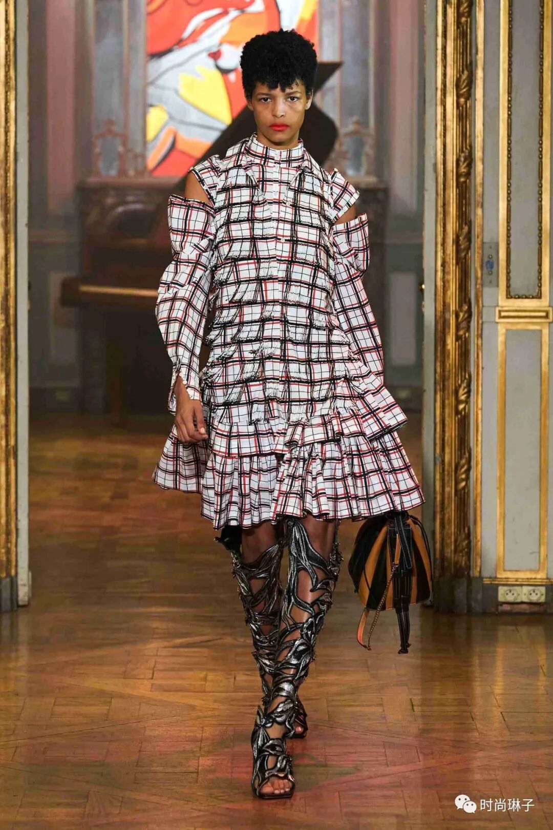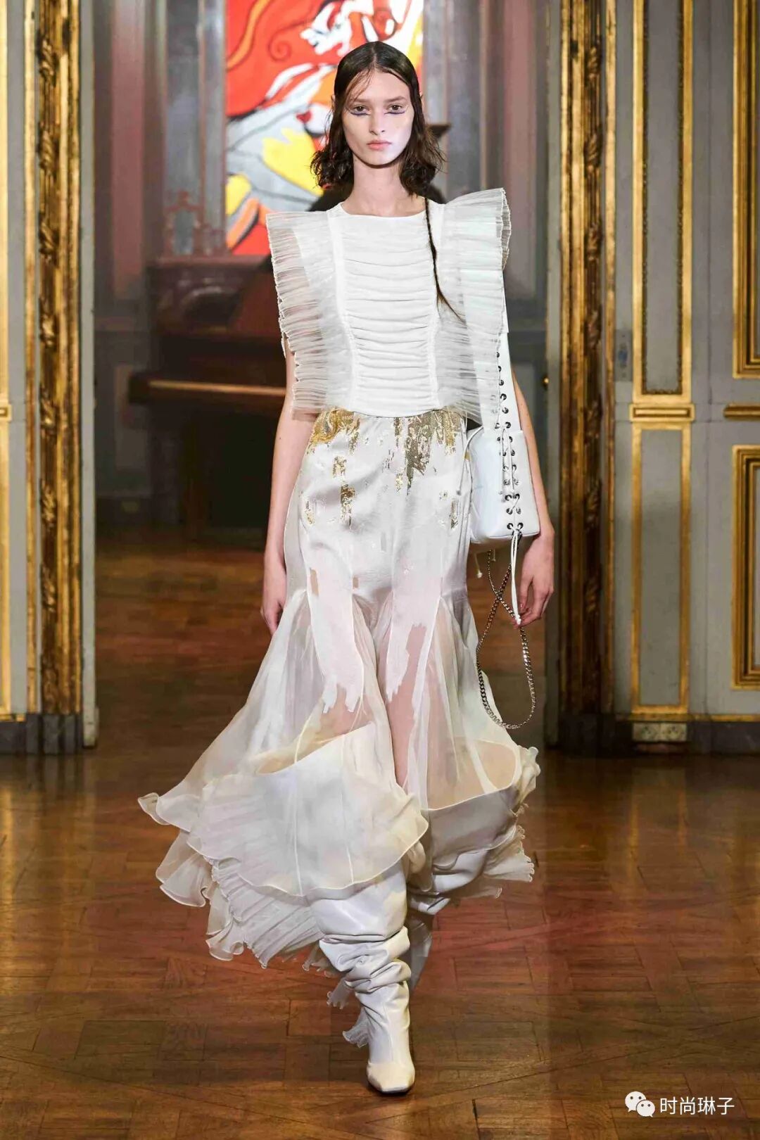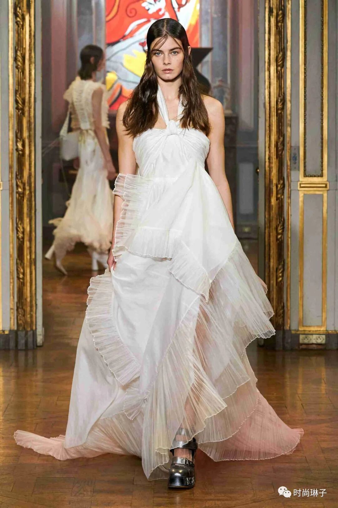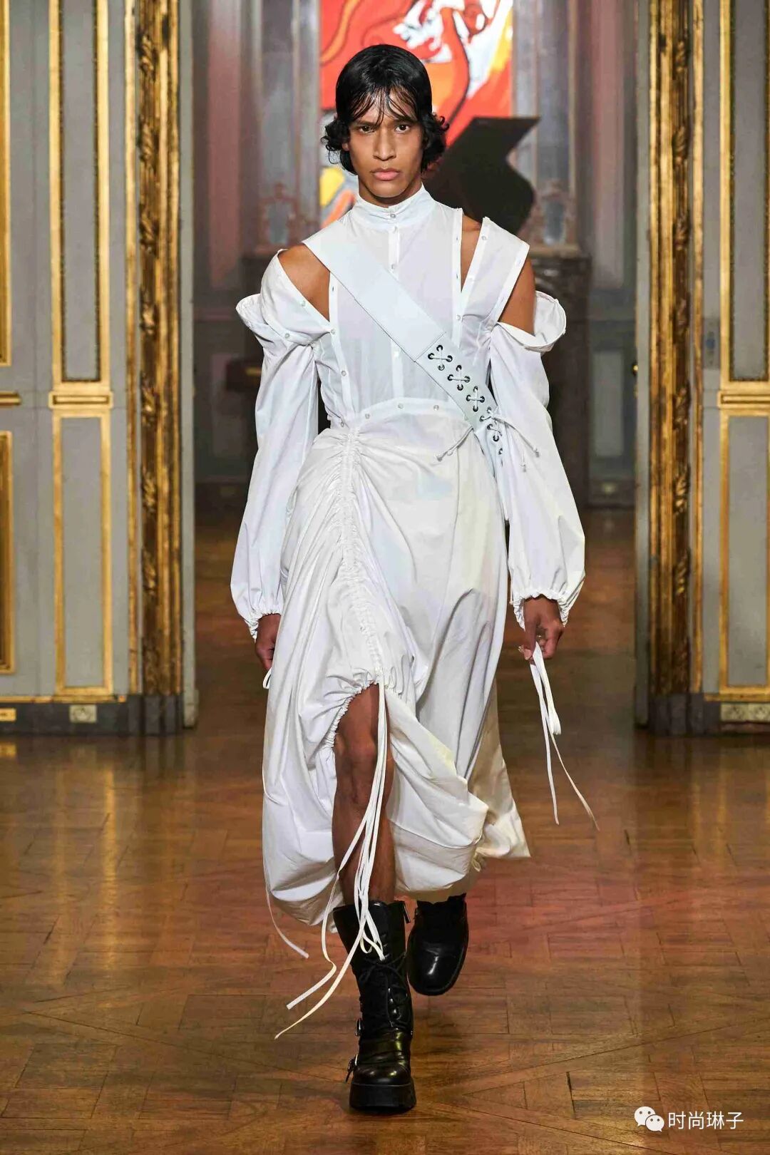 从裁剪的肩部造型到抽绳的裙装设计,皱皱薄纱在裙子上创造出不对称的轮廓,第三组造型的解构主义使该系列更具层次和设计感。