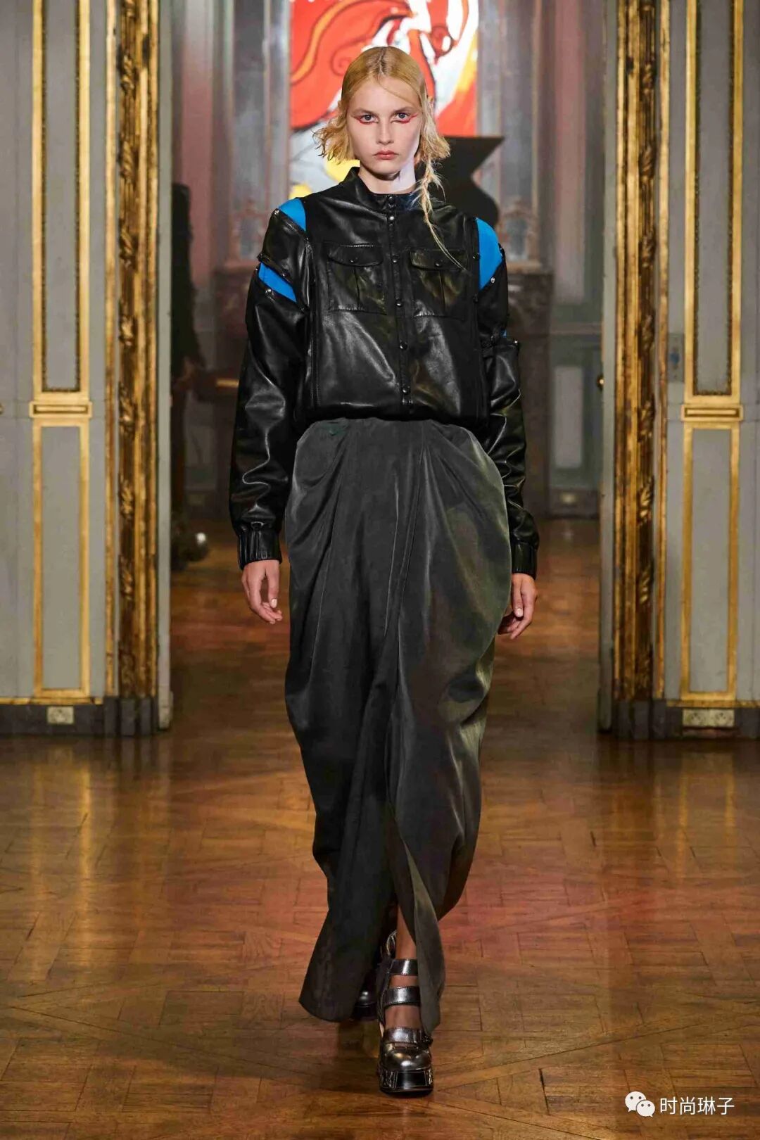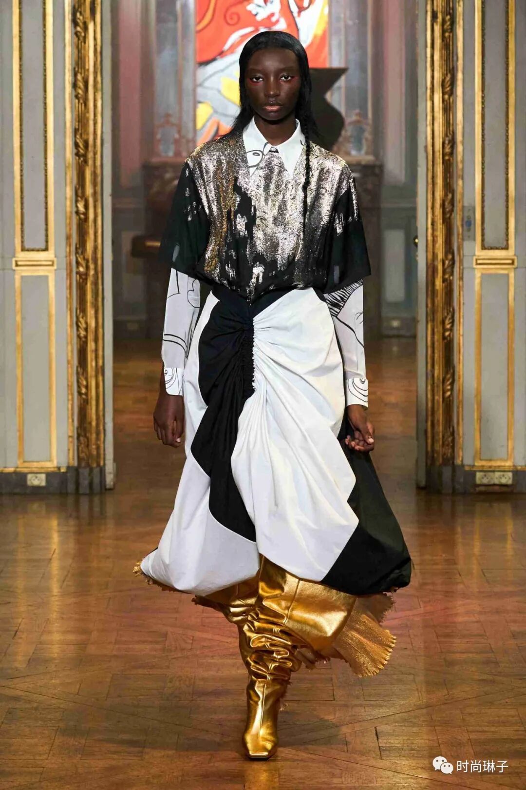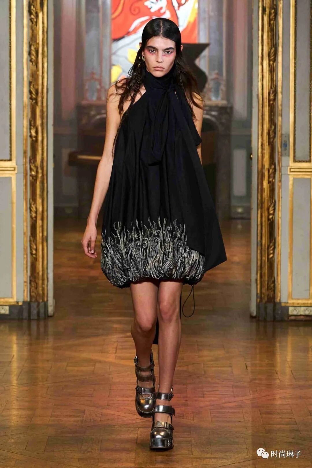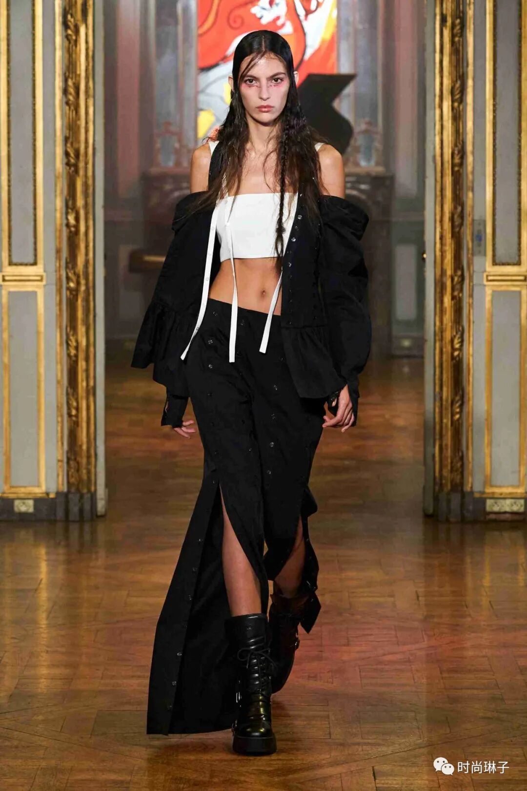 从裁剪的肩部造型到抽绳的裙装设计,皱皱薄纱在裙子上创造出不对称的轮廓,第三组造型的解构主义使该系列更具层次和设计感。