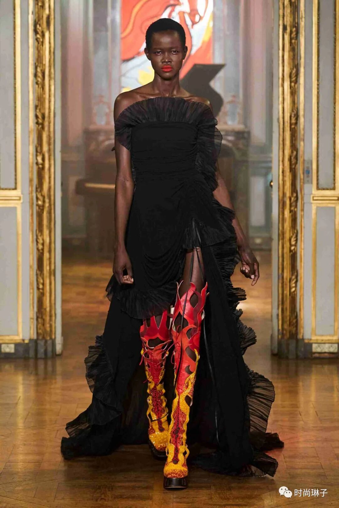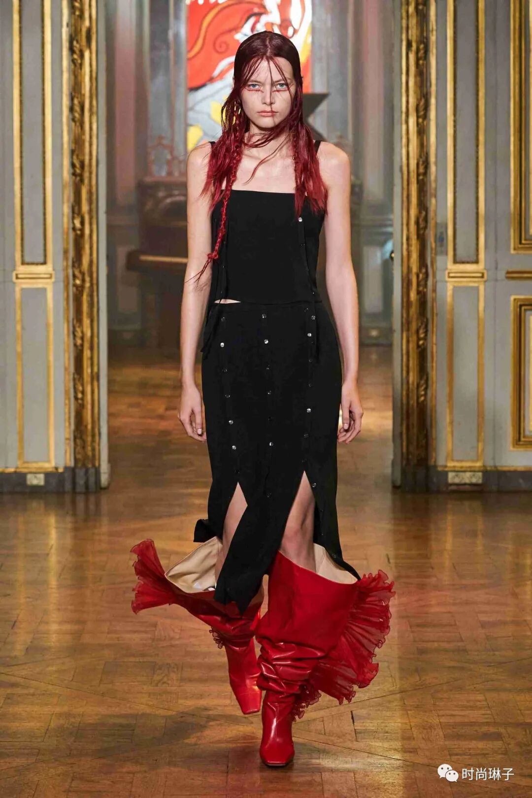 第一组造型大量采用褶裥荷叶边的设计,红橙黑色调深浅不一的交织组合着,就像是新生代设计师心中那份对时装的炽热之情。
