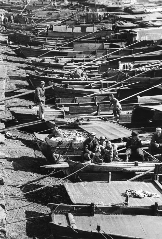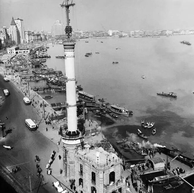 1955年,从上海的黄浦江畔看上海外滩的建筑。上海外滩,是昔日上海的十里洋场,是上海最繁华最热闹的地方。