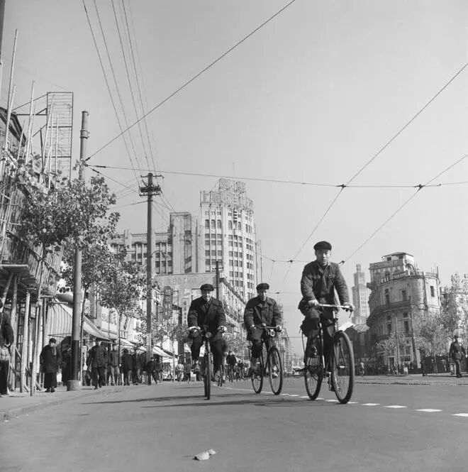 上海街头的自行车。1955年,能有辆自行车那也是很了不得的事情。当年的自行车,不少都是进口的牌子货。