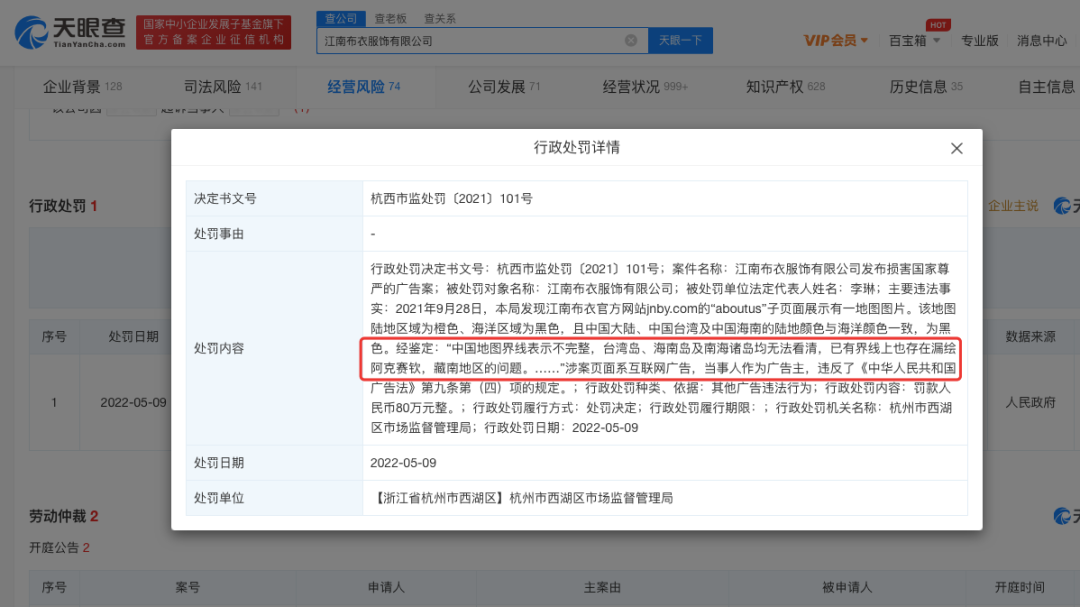 此外,5月31日用天眼查app可查到:江南布衣因发布损害国家尊严的广告,涉案广告地图上的中国地图界线表示不完整等,违反《广告法》相关规定,被杭州市西湖区市场监督管理局处以罚款80万元。