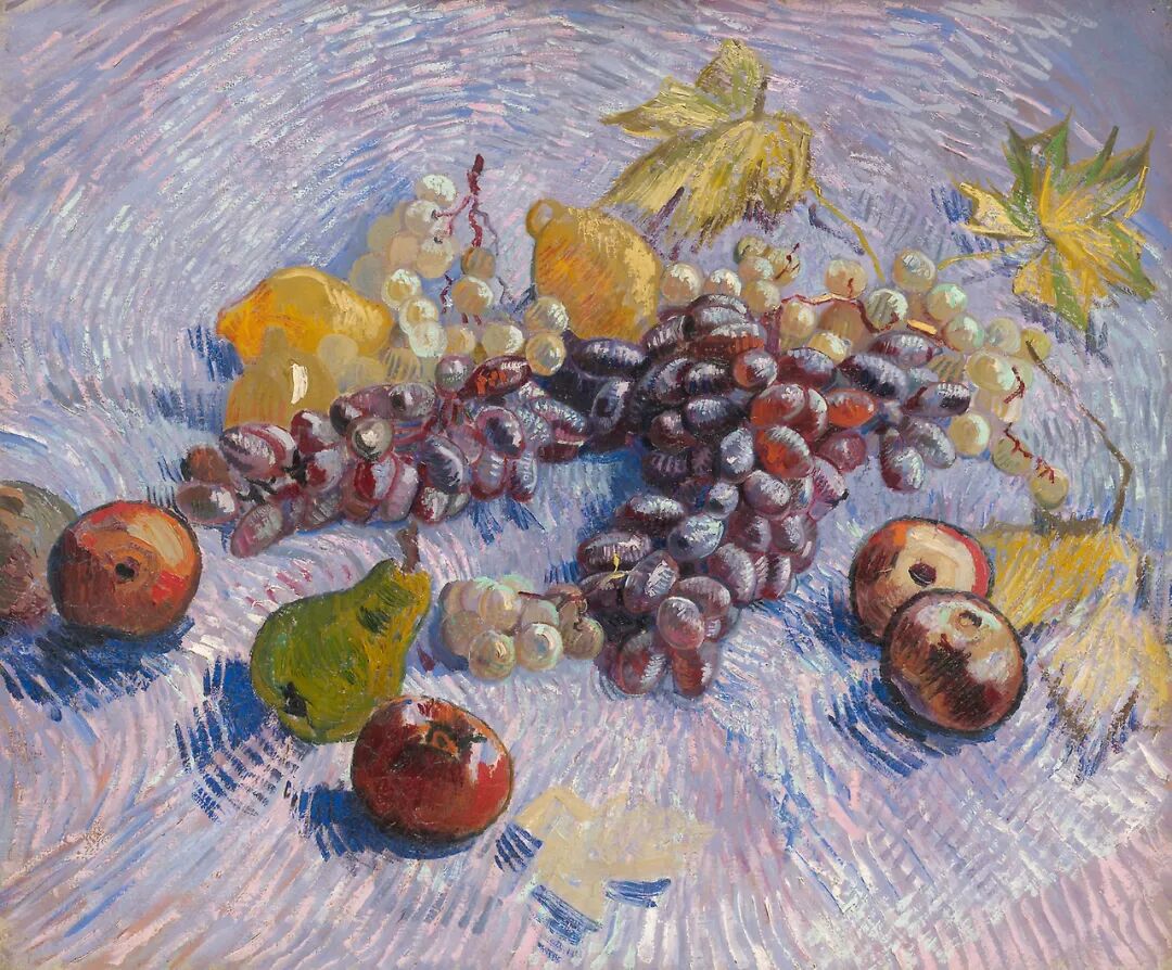 This is one of a group of related canvases featuring seasonal fruit that Vincent van Gogh painted in the fall of 1887. In these works, he simplified his palette, employed more vibrant colors, and used a thicker, broader paint application than he had earlier. Here he explored the use of complementary colors—yellow and purple, blue and orange, and red and green—in the service of chromatic intensity. The effect of these color contrasts is heightened by the pulsating pattern of brushstrokes that defines the tablecloth and creates a force field around the fruit. The painting was probably among the “violent still lifes”—to quote Van Gogh’s friend the painter Emile Bernard—that he included in the group exhibition of young avant-garde artists that he organized at a local restaurant in November–December 1887.