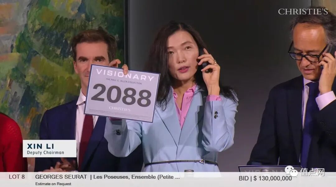 两人往回约20口喊价后,拍卖官于US$1.3亿落槌,李昕成功为「2088」号牌客户投得心头好,连佣成交价逾US$1.49亿(RMB 10.67亿)。