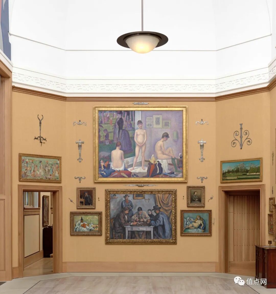 《模特们》有两幅,一大一小。大的由美国巴恩斯基金会收藏,小的便是今次这幅。虽然大画一般比小画更受欢迎,但小版《模特们》的点彩画特色更为明显,故也深得藏家与艺评家之喜。至于《模特们》的习作,主要集中描绘模特儿姿态,则由巴黎奥赛博物馆等顶尖美术馆收藏。