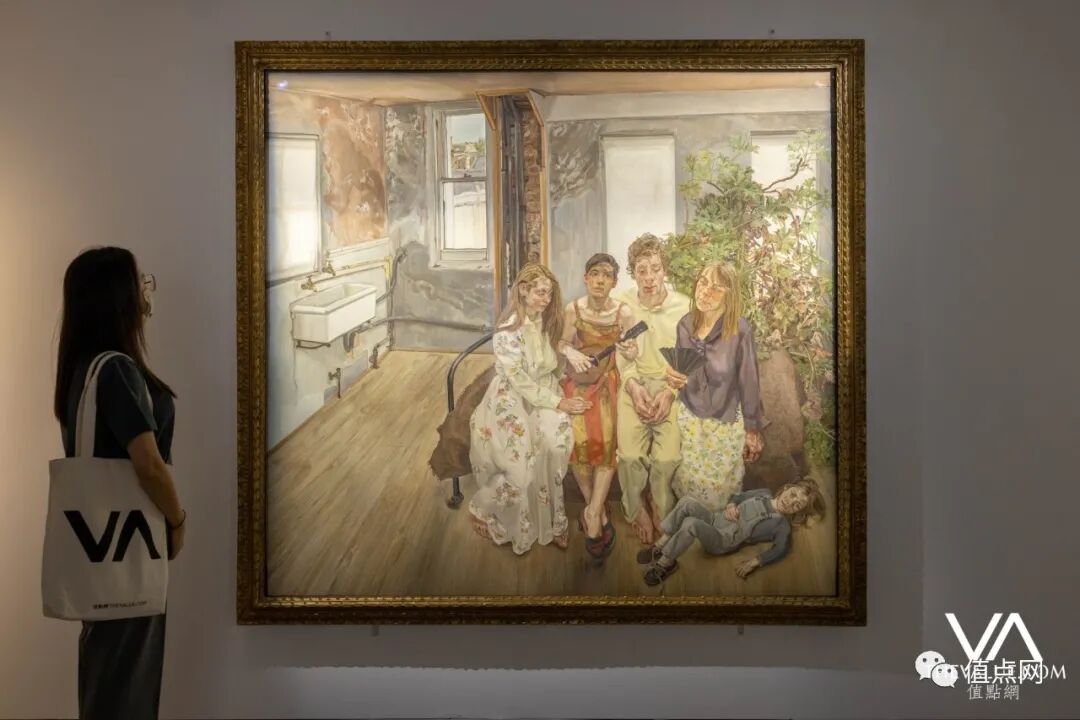 他让同一位模特儿摆出不同姿态,一化成三入画。三人置身绘画工作室,墙壁挂着秀拉代表作《大碗岛的周日下午》。与此同时,他又把《大碗岛的周日下午》中的人物衣饰,举如帽子、雨伞、衣裙等等,加入到工作室的空间,借此在构图上模糊了真与假、虚与实的界线,别具匠心。