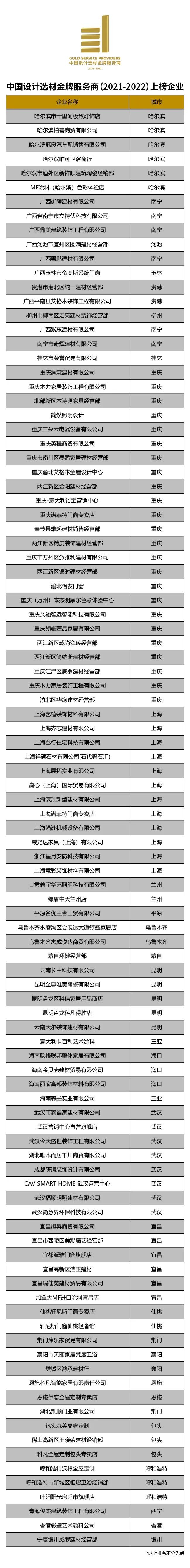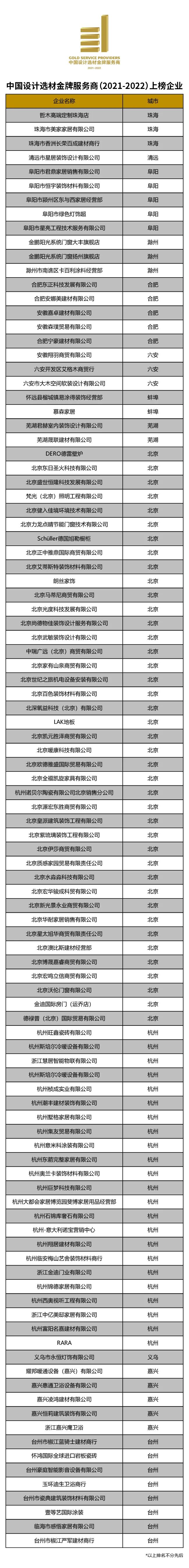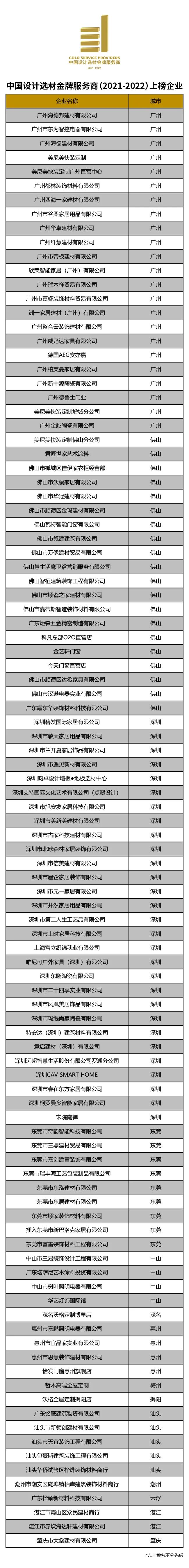 “中国设计选材金牌服务商”评选活动,作为首个从设计师选材服务力的视角评选优质经销商的年度榜单,缘起于广州设计周十余年服务数千家优质经销商对接设计师选材的经验共享,自2016年成功举办以来,盘点了全国逾2000家优秀经销商企业,为服务设计师选材提供了一个优质经销商的识别参考。