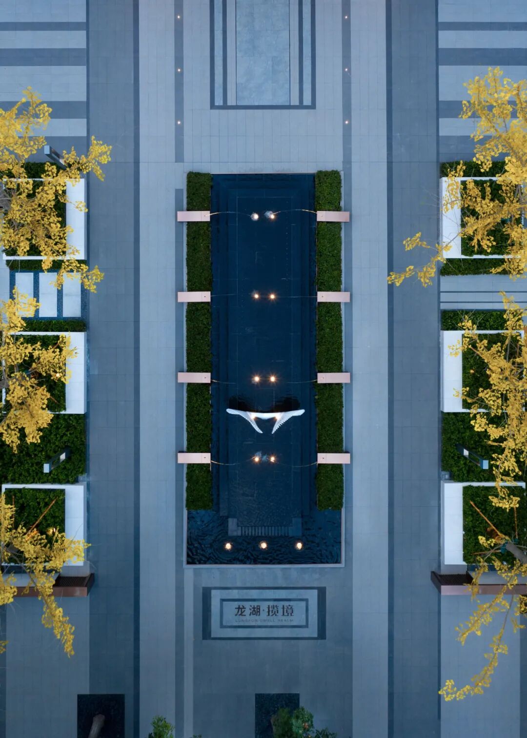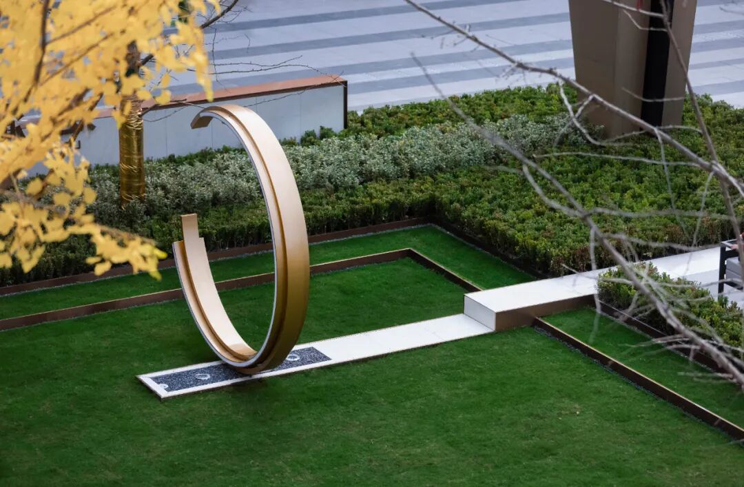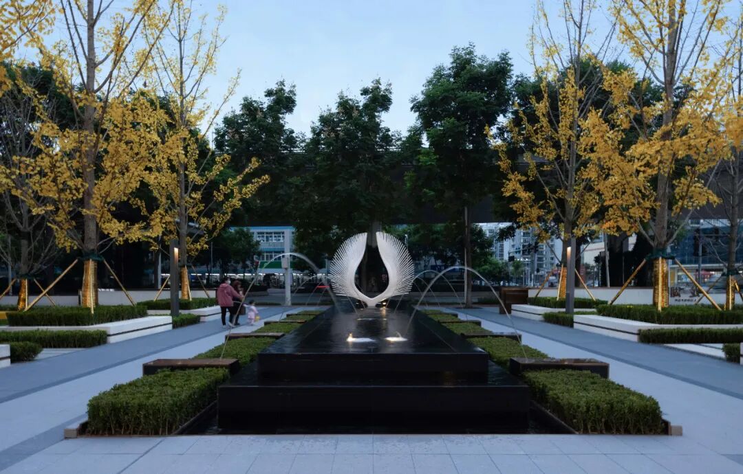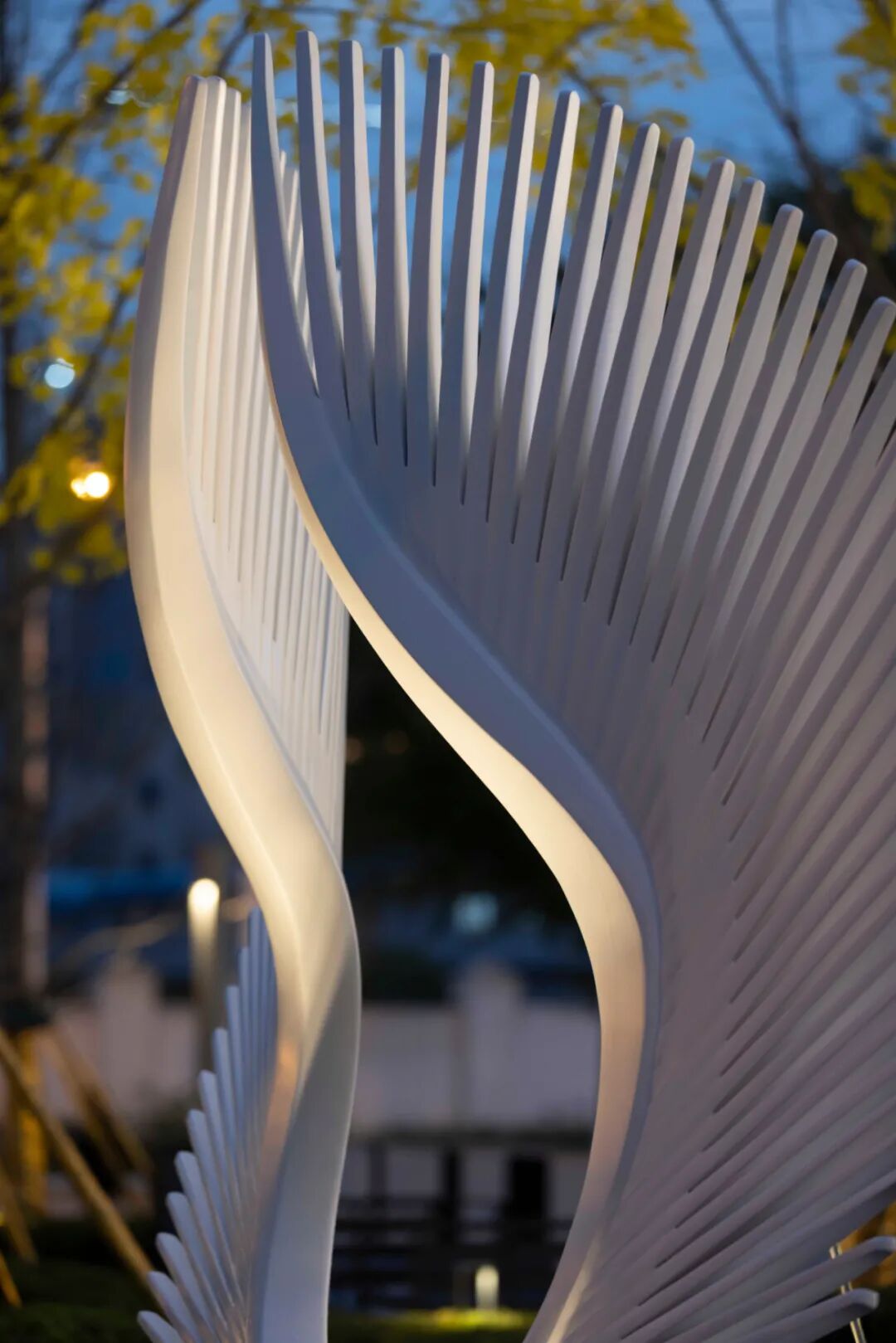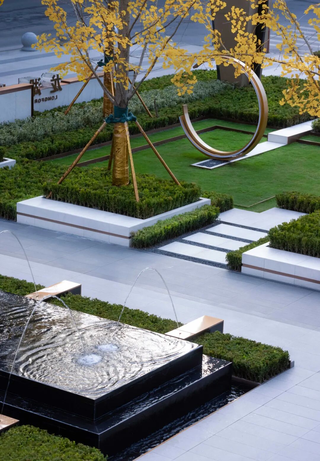 中轴水景改造之前为花坛,视觉杂乱不通透,视觉质感也显得粗糙,为了提升中轴步道的礼序感和仪式感,打造香槟金色的台座,配合黑色大理石板打造的跌水池和白色羽翼雕塑,提升整体质感。