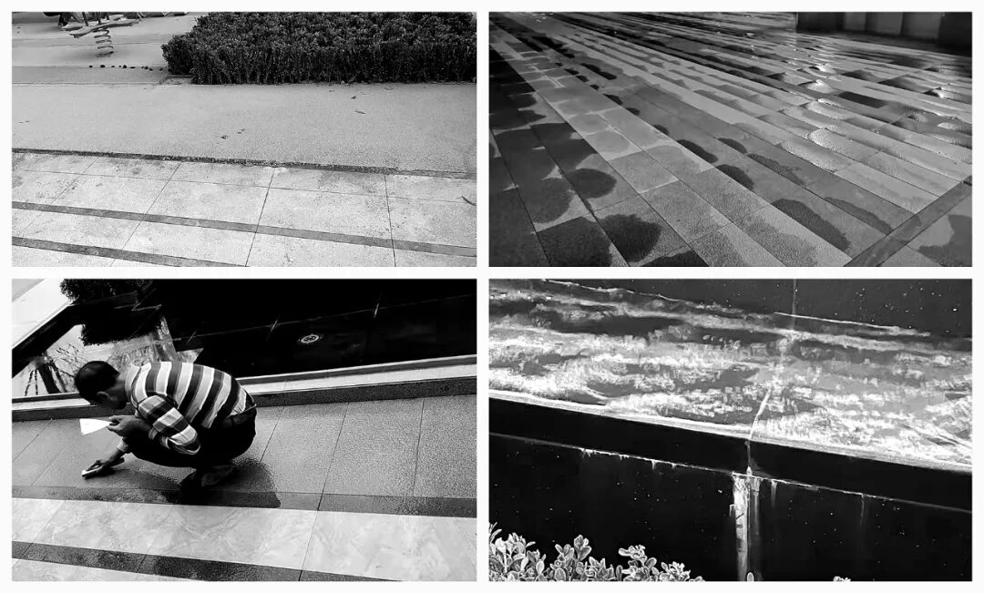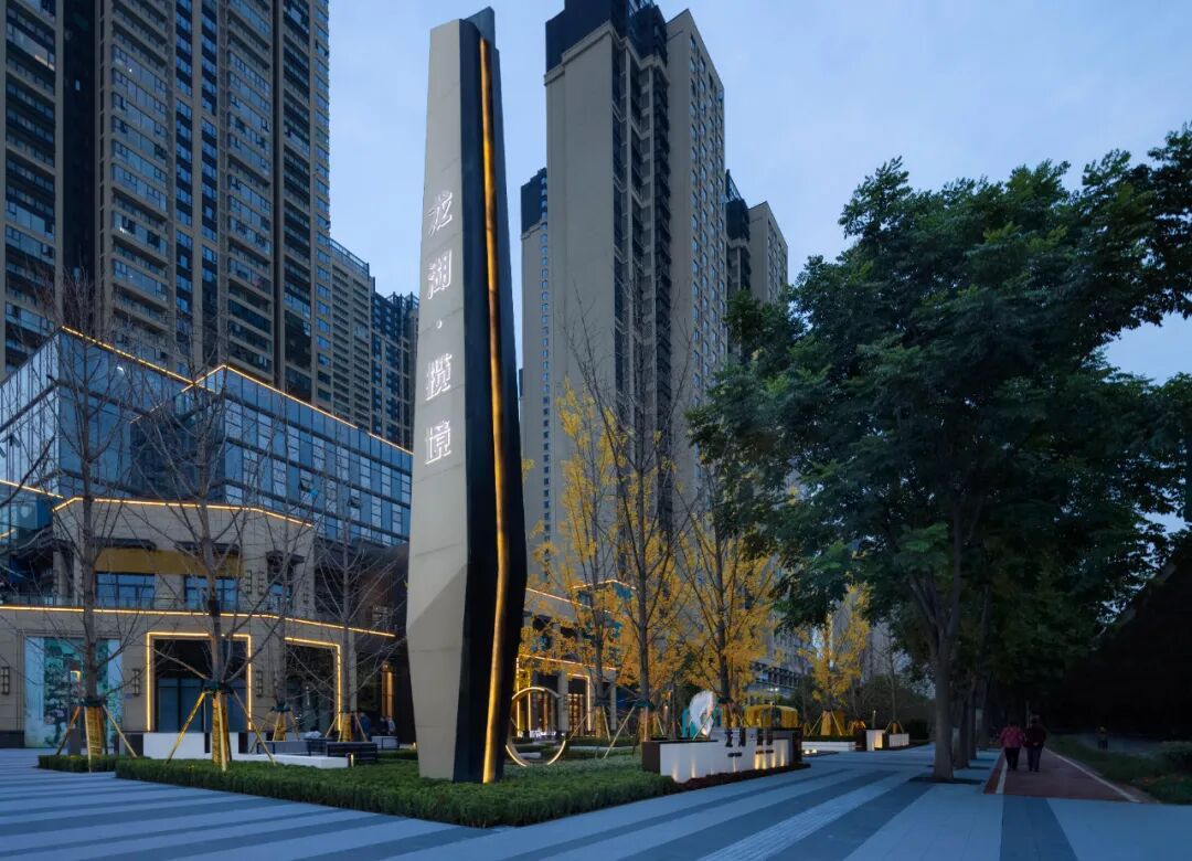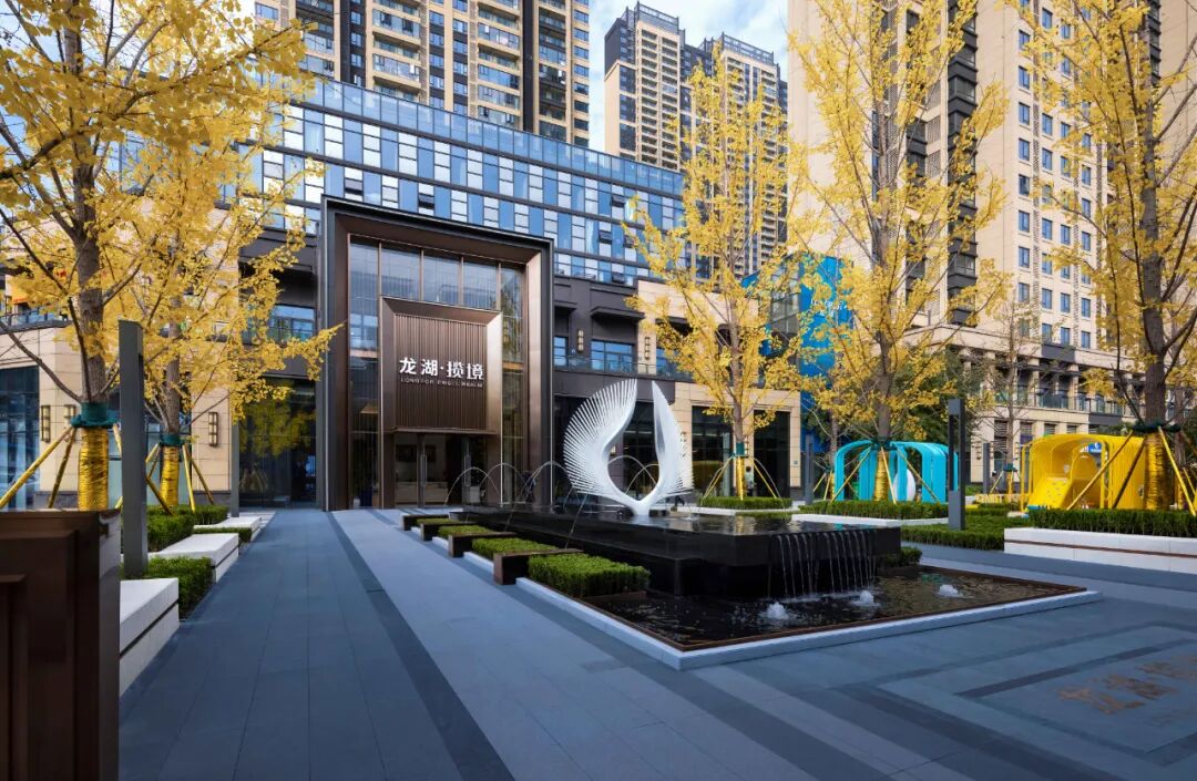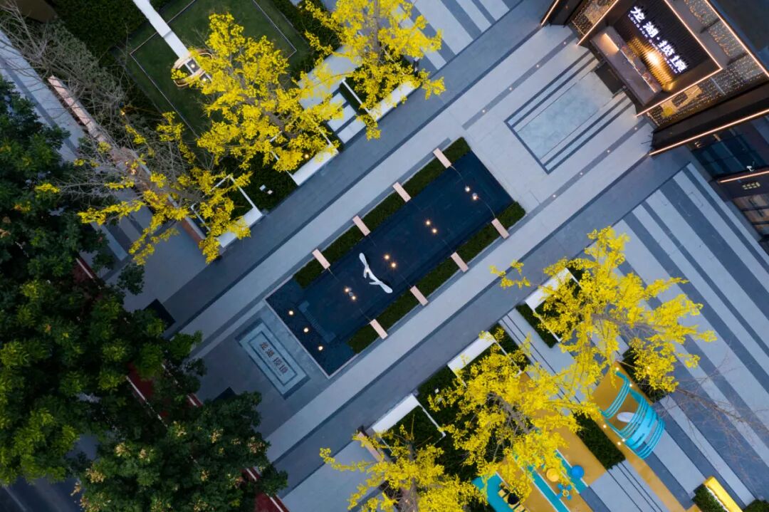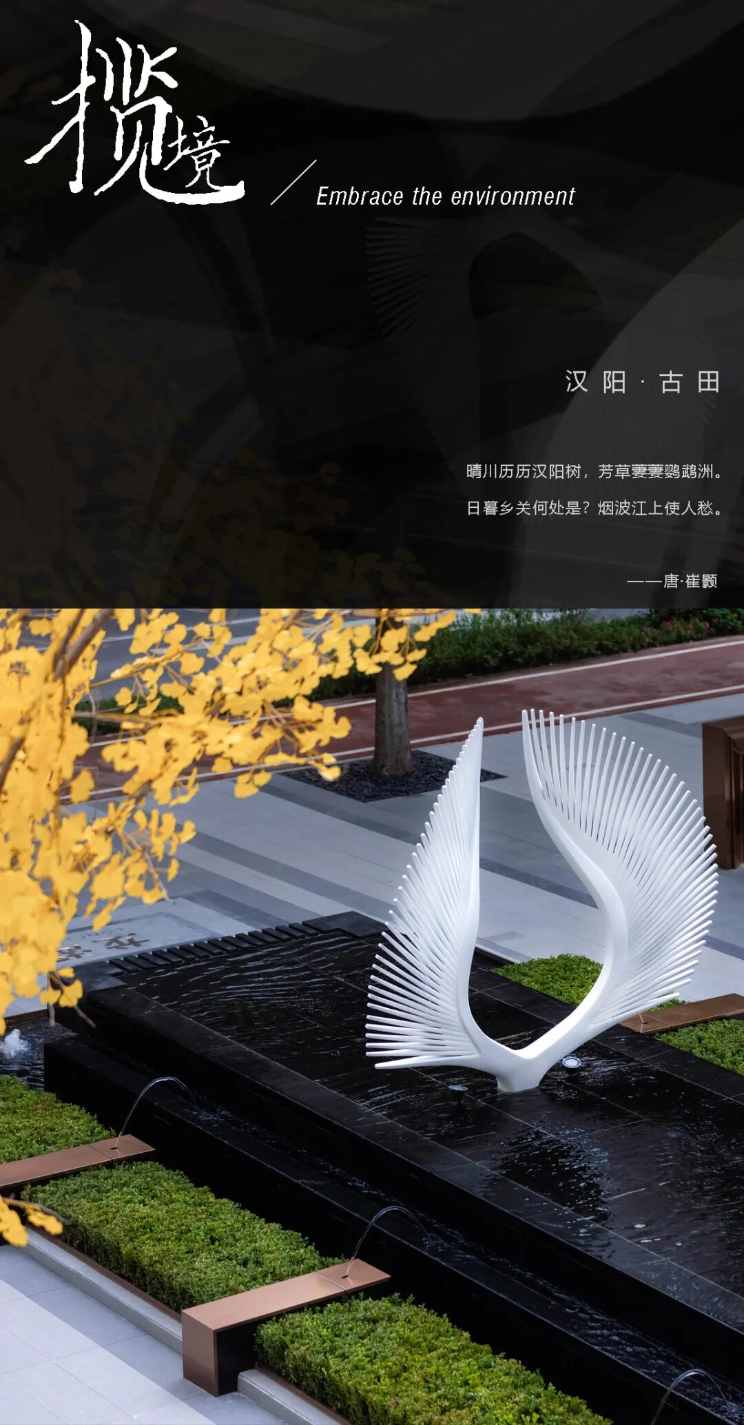 中轴水景改造之前为花坛,视觉杂乱不通透,视觉质感也显得粗糙,为了提升中轴步道的礼序感和仪式感,打造香槟金色的台座,配合黑色大理石板打造的跌水池和白色羽翼雕塑,提升整体质感。
