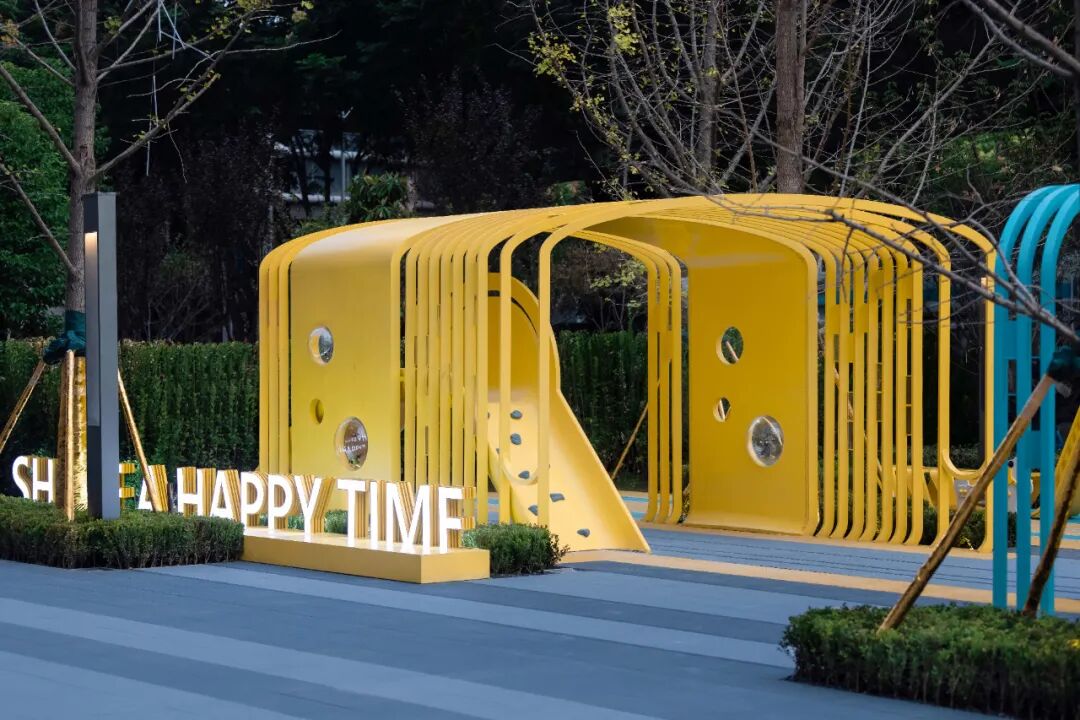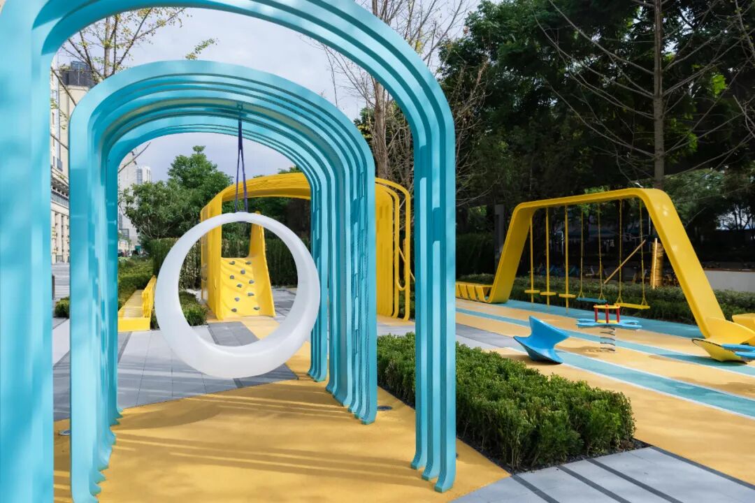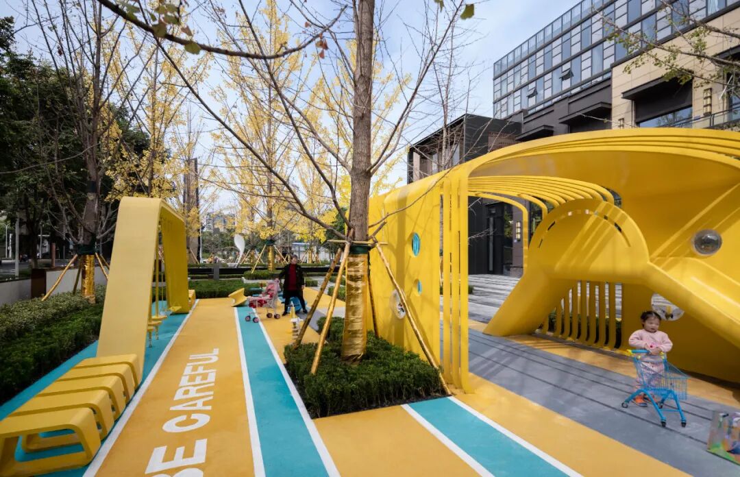 构架我们以弹性作为构型灵感,做了疏密有致富有变换的线条,它们密集时形成隔墙,梳离时形成通道,与各种富有变化地空间,它们一起形成的既是儿童游乐地,亲子活动地空间,也是青年潮玩与网红打卡地去处。