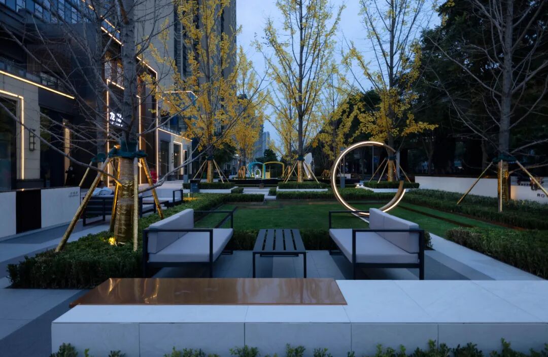 通过巧妙地绿篱植物围合,通过景墙高低地衔接,我们在这繁华地闹市中打造出了一块静谧地休憩场所,这里是繁忙城市的一个留白,也是对未来小区生活的初步畅想和演绎。