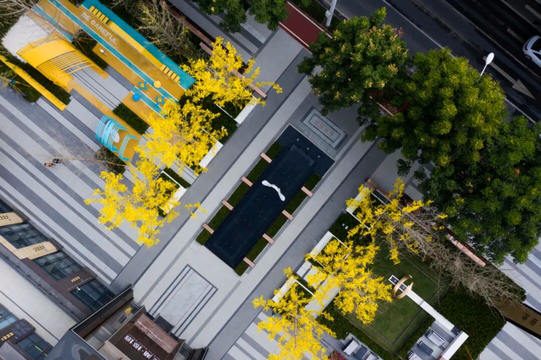 步入街角,首先映入眼帘的是带有案名的精神堡垒,似银杏叶肌理的线性铺装引导人流自然地进入场地,集聚人气活力。
