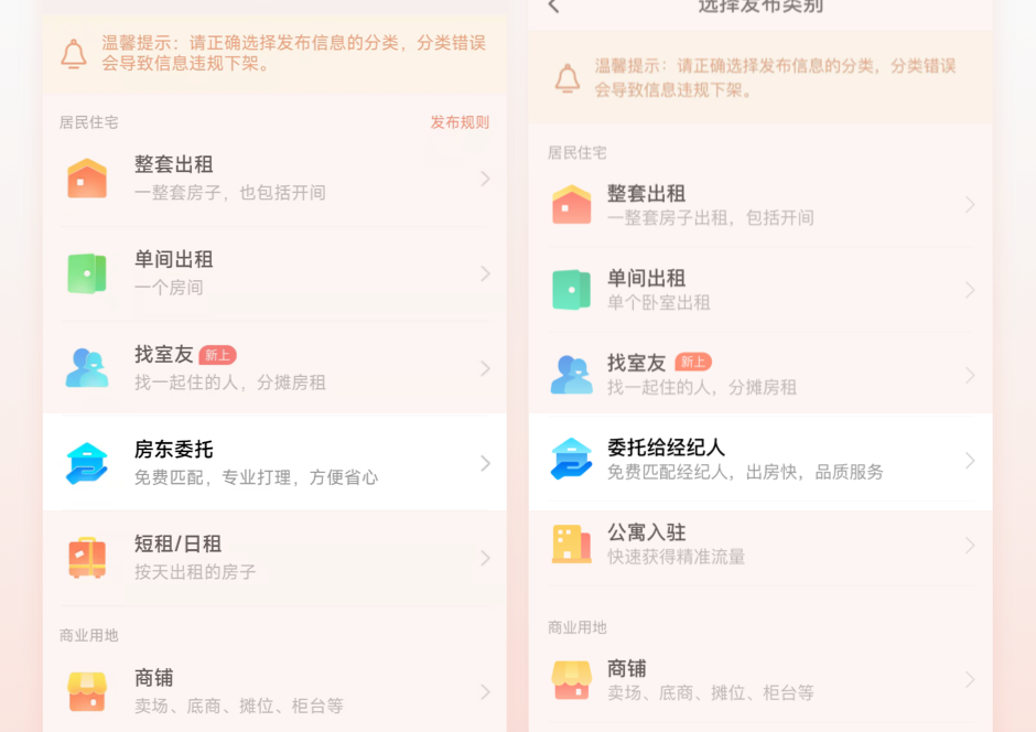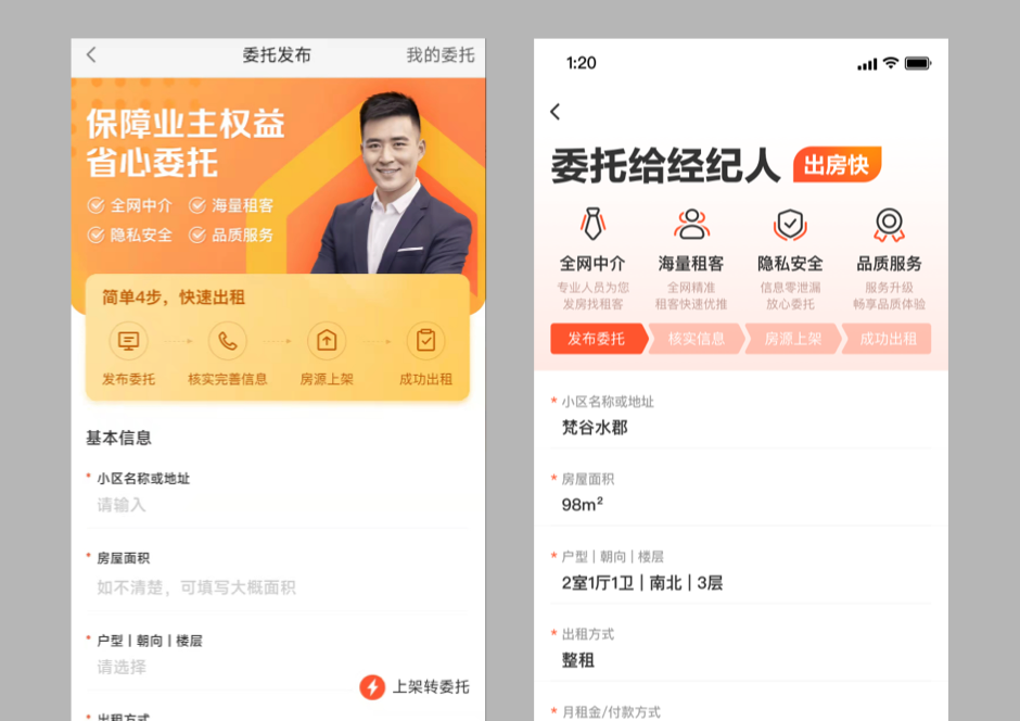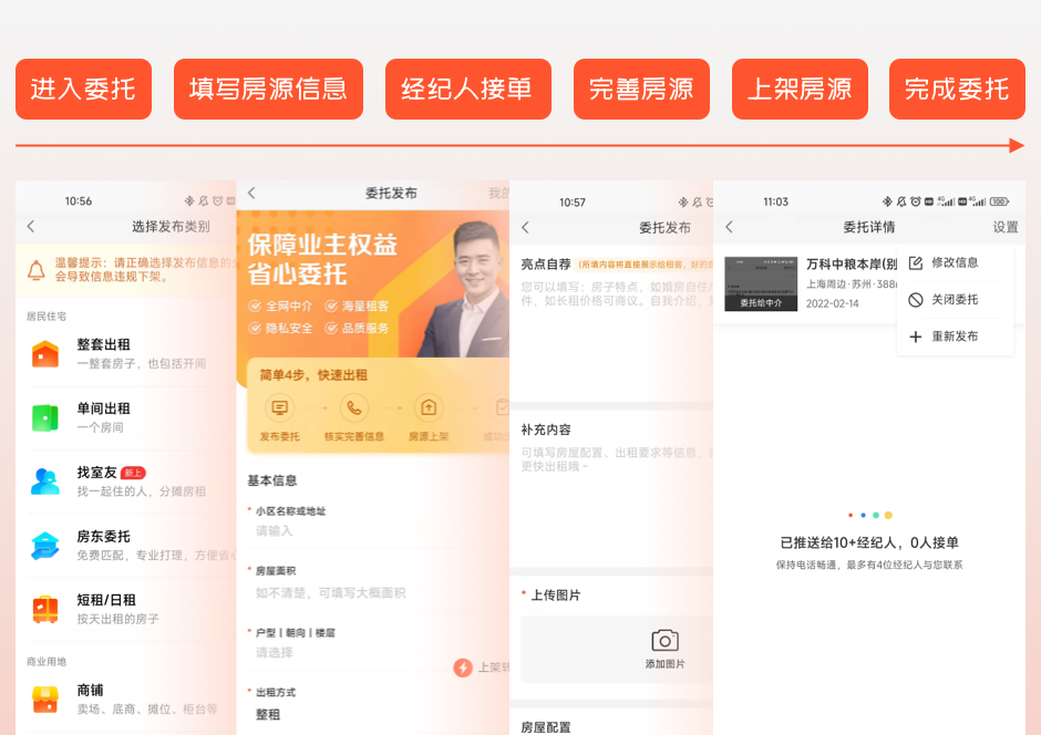 由于房东群体的年龄普遍为中年,而委托业务的服务模式又较为新颖,所以用户对于委托的认知不够清晰,在委托的入口、发布页对于委托服务的表述不够清晰明快,导致有信息差,进而和用户之间产生了一定的距离感,用户不敢贸然使用,也不知道委托能给房东本人带来哪些好处。所以第一步是将委托发布流程,做结构化梳理,清晰透传协同服务的特点,拉平信息差。