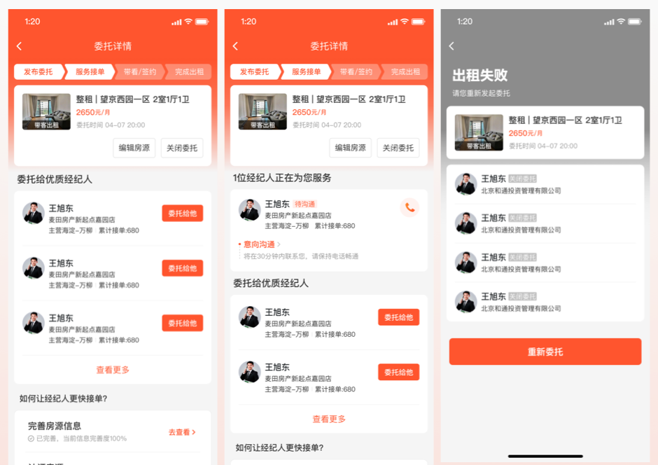 改版前,用户的房源发布成功后,只能被动等待,对后续的流程也一概不知。升级后,我们为用户提供了更多选择,用户可以在发布完成后进入到选择经纪人页面,我们给用户一些主动选择的机会,用户可以进行多选,如果能够直接匹配到合适的经纪人,则直接进行到下一步,如果没有选中合适的经纪人,系统还会持续推送新的经纪人,并且在服务的全过程当中用户可以看到当前处于什么环节,让用户有掌控感,这种“送出主动权”的方式,可以极大的减少用户的跳出率,从而提升用户的出房效率和出房体验。
