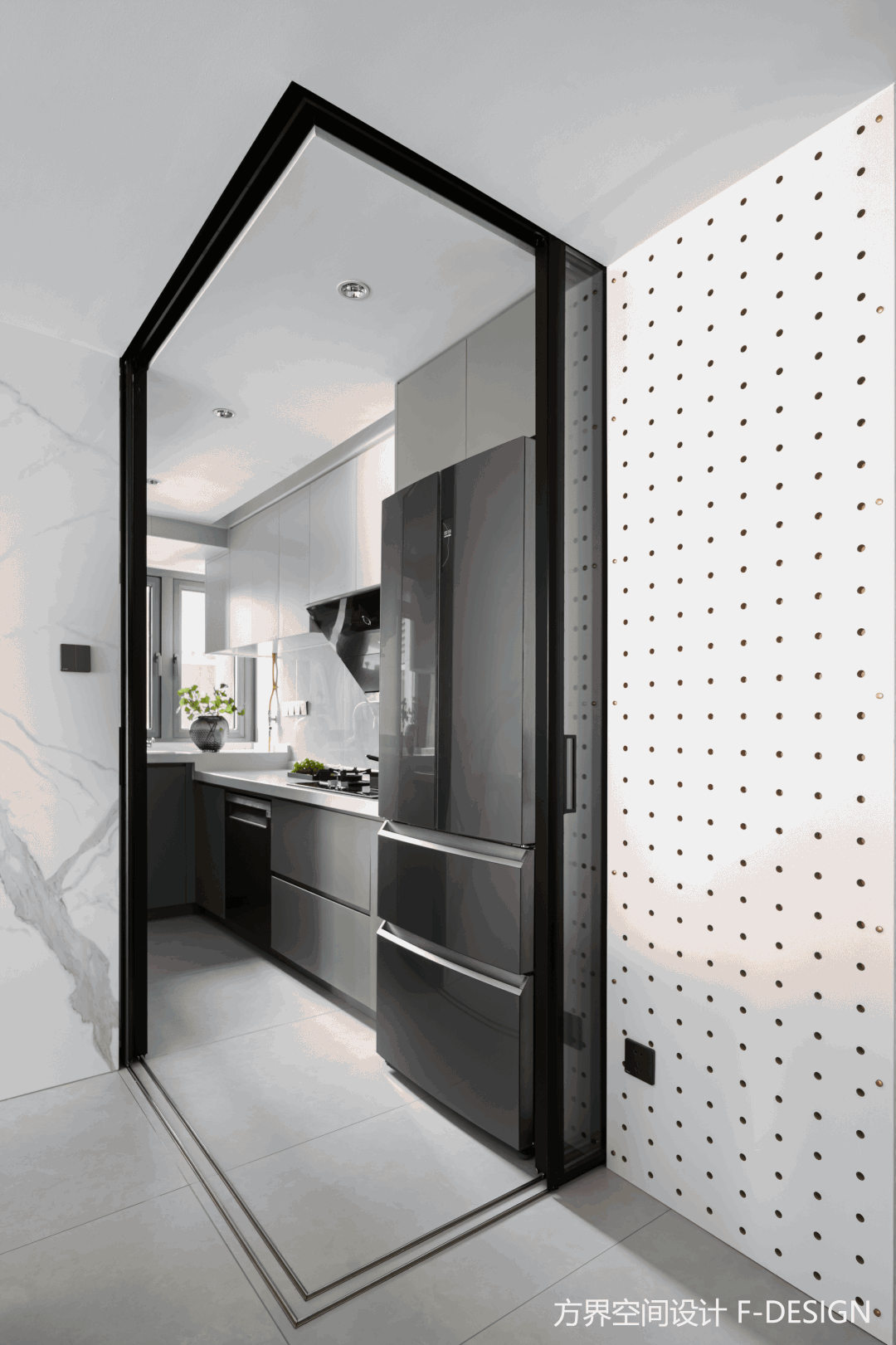 考虑到厨房油烟问题,厨房做了90度两个垂直方向的玻璃移门设计,既解决厨房油烟味的问题,同时又保证了空间的通透性和互动性。