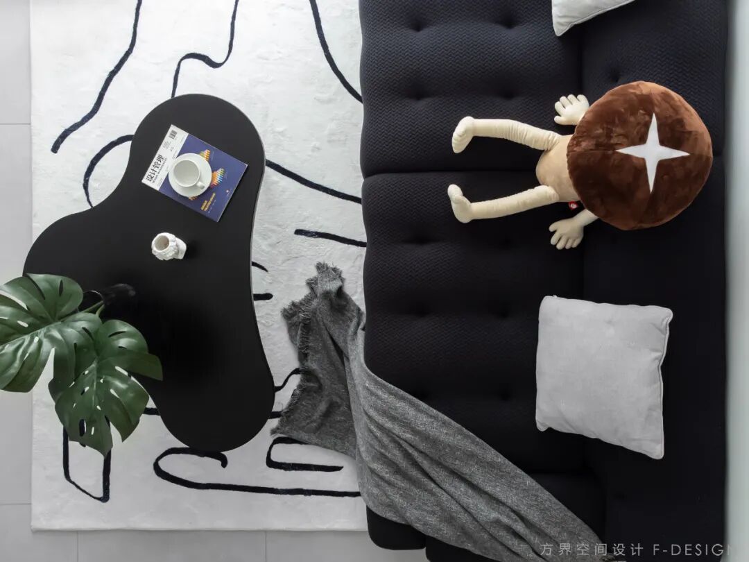 The Living room to white-based, pure white to bring a fresh and natural feeling. White walls, white storage cabinets, gray ground, the black and white tone of the overall space, reflecting the minimalist aesthetic space.