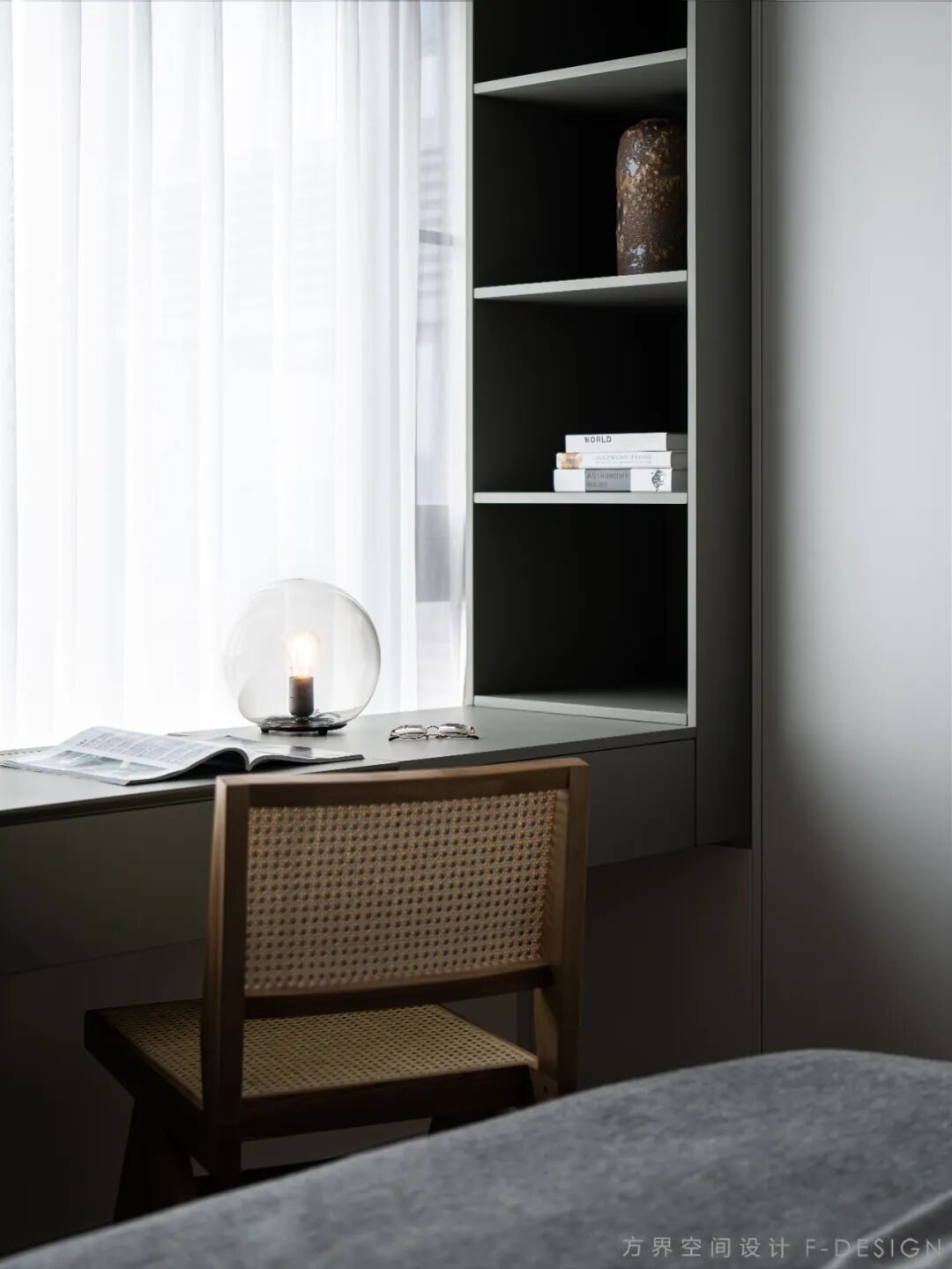 从业主的使用功能考虑,要同时满足梳妆和办公的需求,保留采光和好的视线。采用橱窗的设计手法借景,达到功能与美感的完美结合。