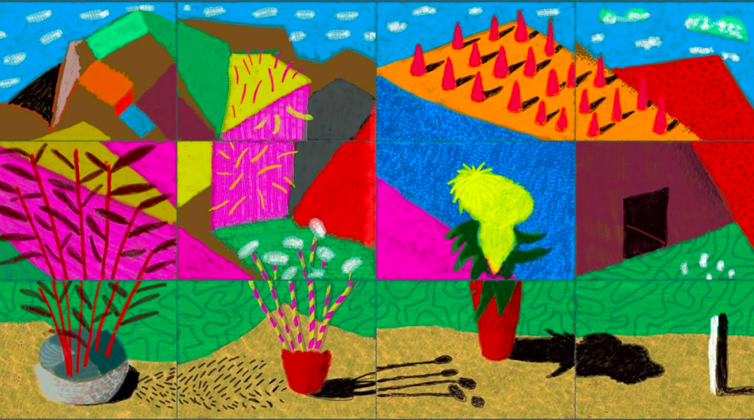 在他的 iPad 绘画中,每个画廊都将展示两个不同系列的经过编辑和签名的喷墨印刷品:五幅风景画、二十幅花卉静物画,以及一幅由三幅 iPad 绘画组成的合成作品,描绘的是剑兰。 这两个系列揭示了霍克尼之手的存在,以及他在 iPad 上绘制具有传奇色彩的作品的深思熟虑的技巧。 霍克尼的花朵捕捉了他的主题稍纵即逝的静止,而他身临其境的风景则营造出广阔的乡村环境。 无论是局限在某一时刻,还是从多个视角创造出来,霍克尼独特的时空感都借鉴了从贝叶挂毯和 17 世纪中国卷轴到亨利·马蒂斯 (Henri Matisse) 的静物画等艺术史范例。在展览的中心,霍克尼还首次展示了他最新的大型摄影作品。 从一系列个人照片中,霍克尼构建了一个无视时间和空间的自然参数的无缝全景。 摄影绘图将观众带入一个既熟悉又全新的自我参照世界。
