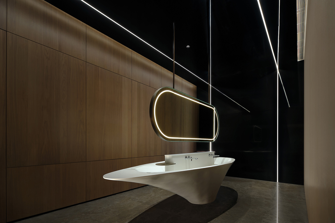 摆脱常规洗手台设计常态,吊入悬空镜面,线条感与体量感相结合,辅以四面灯光点缀,充满活力与趣味。