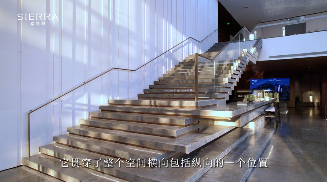 由楼梯位置望向入口接待区,形态交错的盒子样式,确立整体布局走势,于递进式的节奏中,囊括包容大气之意。