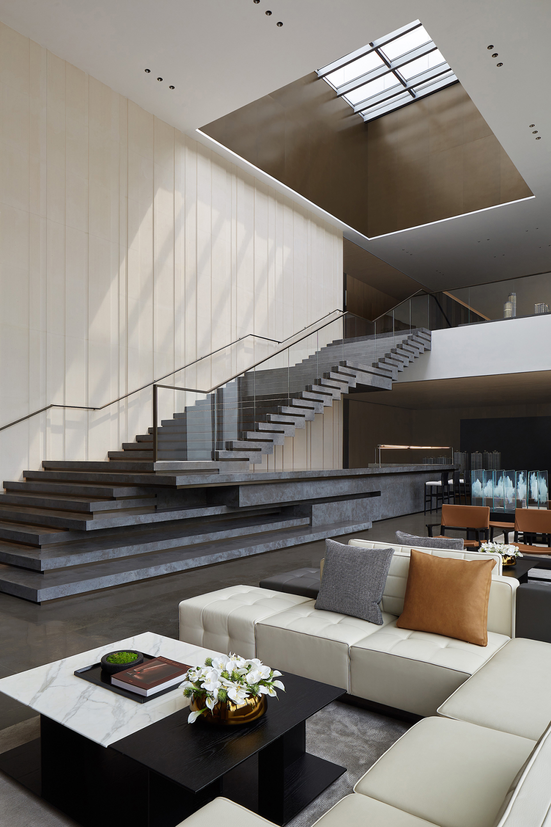 一条主轴线将接待区与楼梯动线一分为二,当访客步入接待区落座、对谈时,光线引入,将内外空间联通。