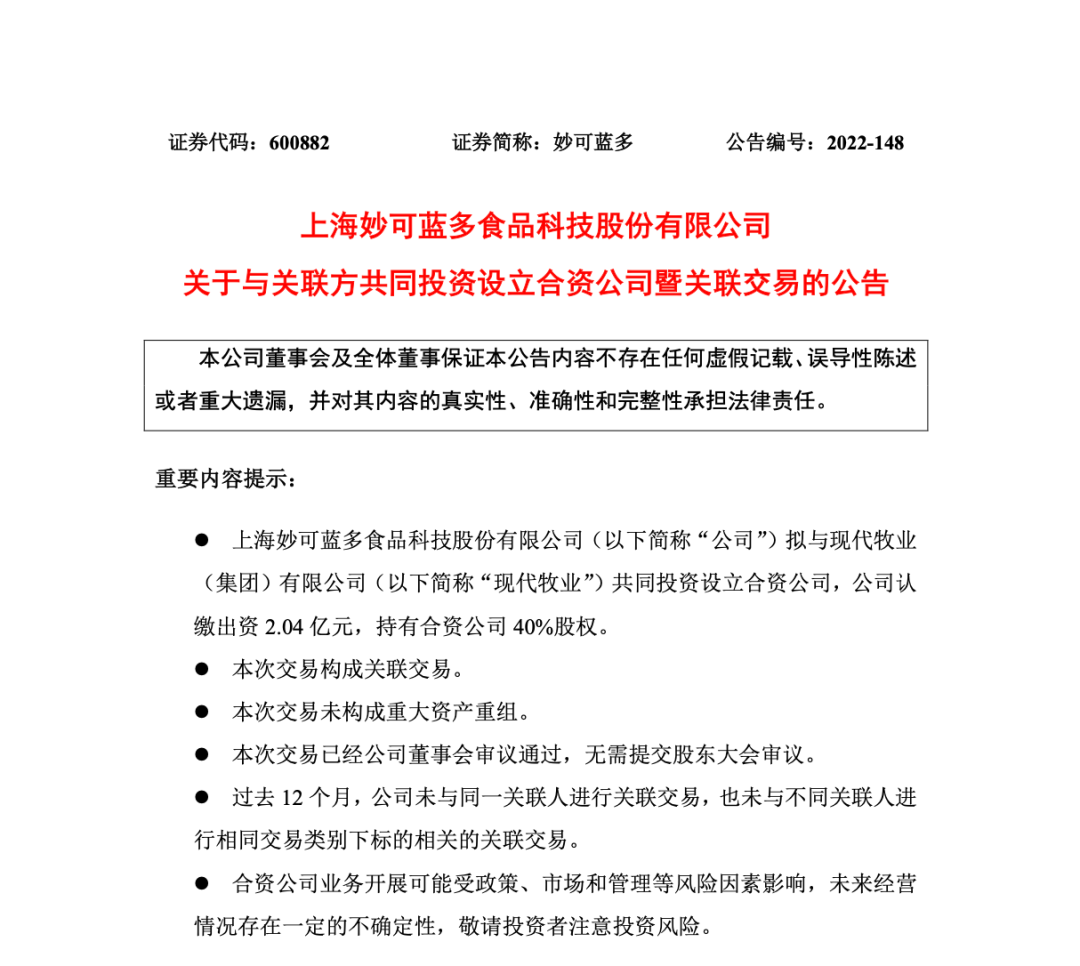 12 月 12 日,妙可蓝多以通讯方式召开第十一届董事会第十五次会议,审议通过了《关于与现代牧业(集团)有限公司共同投资设立合资公司暨关联交易的议案》。根据该《议案》,妙可蓝多与现代牧业将共同投资设立“好多牛牧业科技发展有限公司”,注册资本 5.10 亿元人民币。其中,妙可蓝多认缴出资 2.04 亿元,持有合资公司 40% 股权;现代牧业认缴出资 3.06 亿元,持有合资公司 60% 股权。(Foodaily)