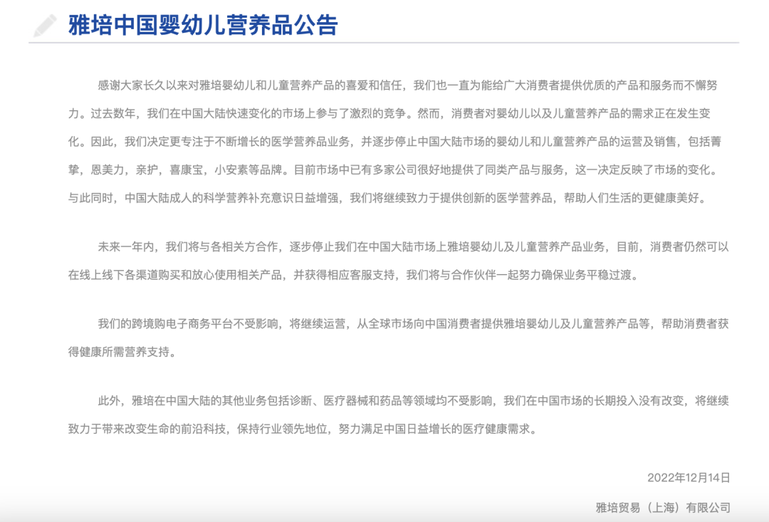12月14日,雅培中国发布声明对外确认,雅培营养品将进行业务调整,重点发展医学营养品业务,未来一年内,将逐步停止中国大陆市场的婴幼儿和儿童营养品的运营和销售,包括菁挚,恩美力,亲护,喜康宝,小安素等品牌。目前,消费者仍然可以在线上线下各渠道购买和放心使用相关产品。雅培的跨境购电子商务平台不受影响,将继续运营,从全球市场向中国消费者提供雅培婴幼儿及儿童营养产品等。(品牌官微)