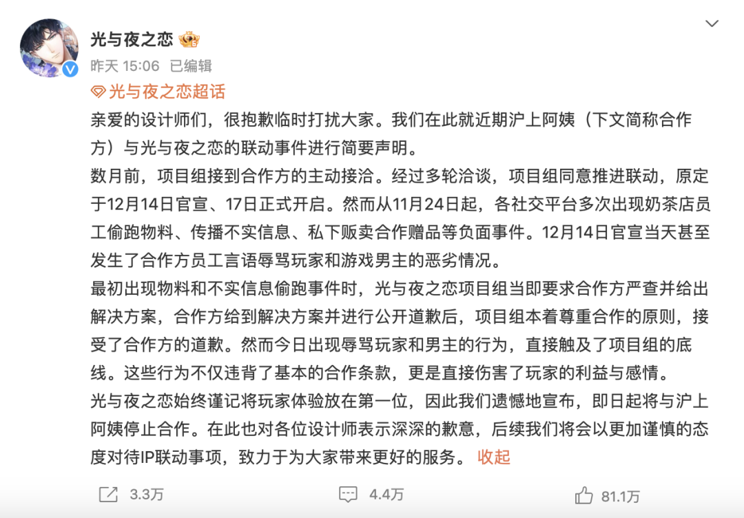 近日,沪上阿姨客服恶意调侃光与夜之恋玩家和游戏男主在网络人引发热议。12月14日,《光与夜之恋》官方微博发布声明称,从 11 月 24 日起,各社交平台多次出现奶茶店员工偷跑物料、传播不实信息、私下贩卖合作赠品等事件,还发生了合作方员工言语辱骂玩家和游戏男主的恶劣情况,因此遗憾宣布,即日起将与「沪上阿姨」停止合作。(光与夜之恋官方微博)