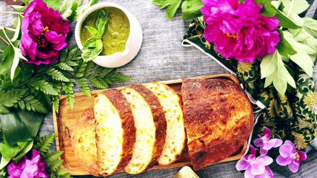 用罗勒叶制作的沙拉酱和香料面包