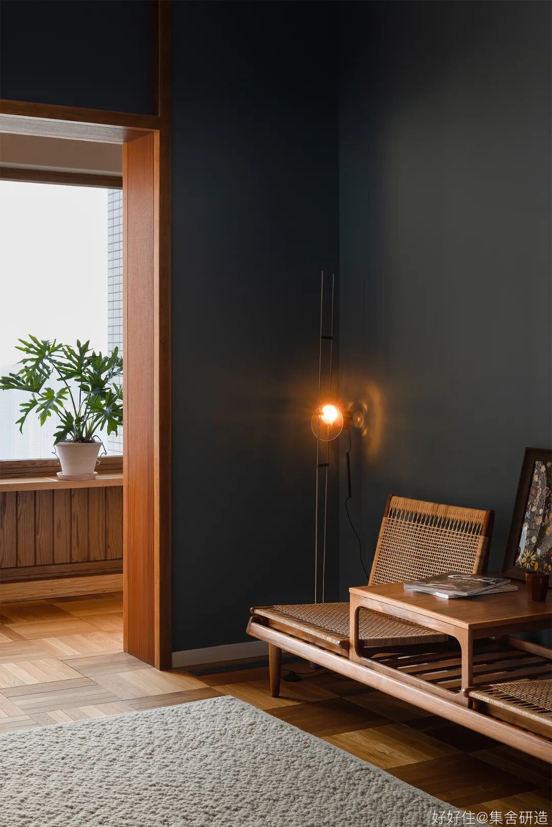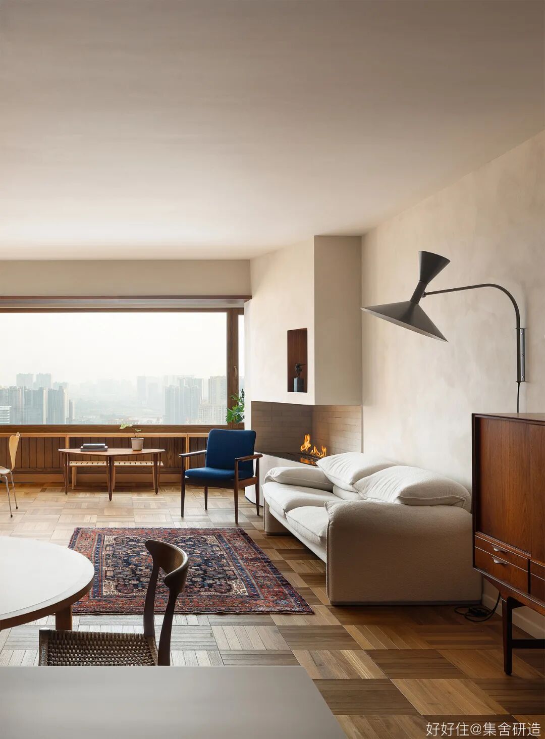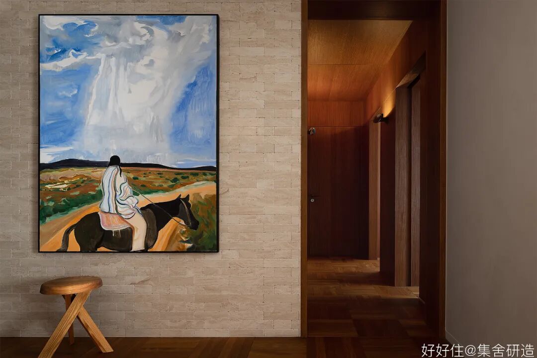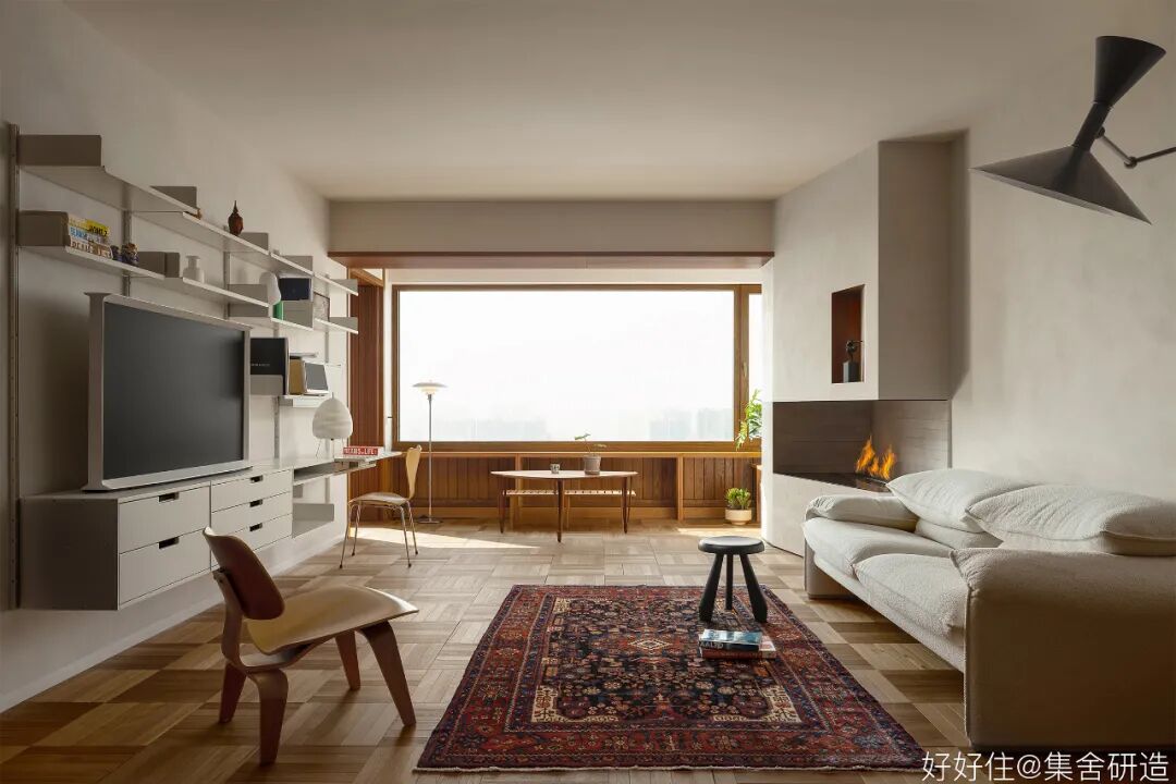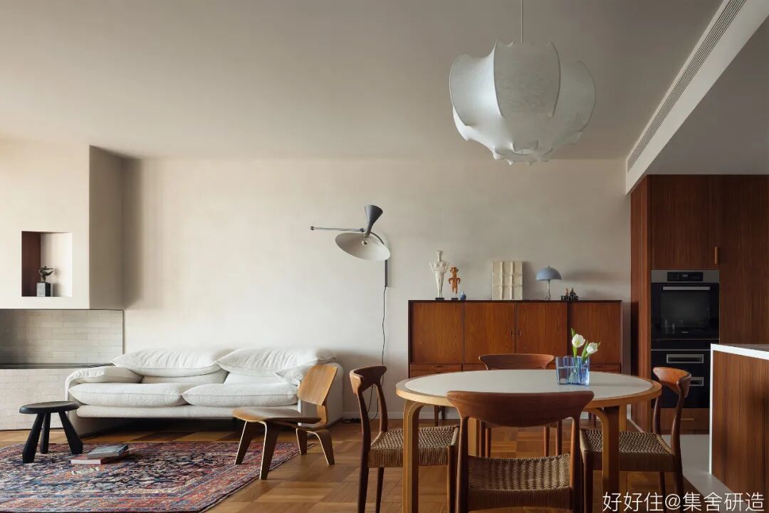 木制窗框和围档打造出这个家温润复古的氛围基调。为了更好实现「生活感」与「复古气质」的平衡,设计师@集舍研造 还选择了有质感的柚木、洞石砖墙搭配二十世纪的中古家具(文末附单品目录),把控不同材质和工艺间的尺度,让空间的每个角落都真实且生动。