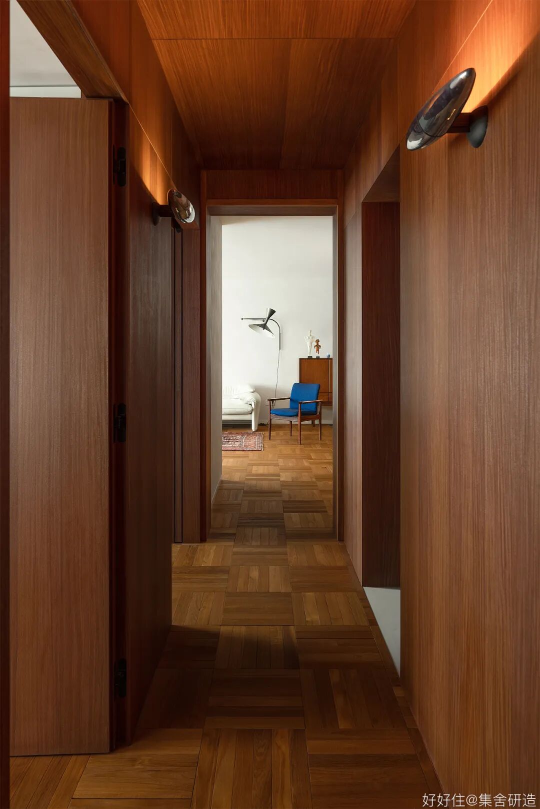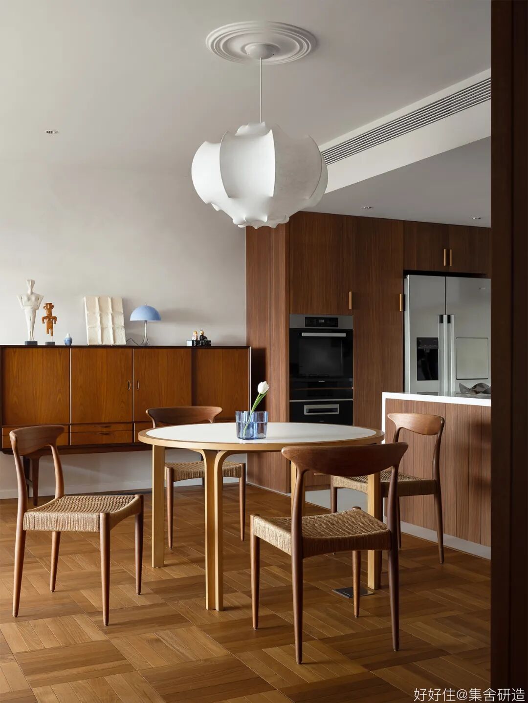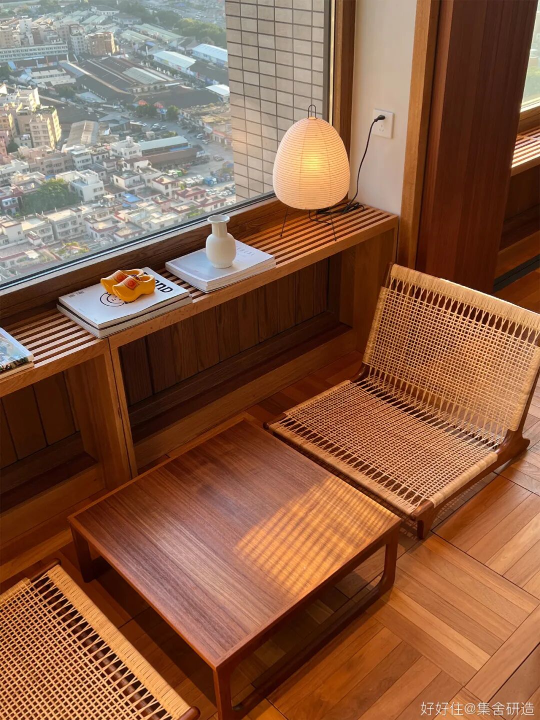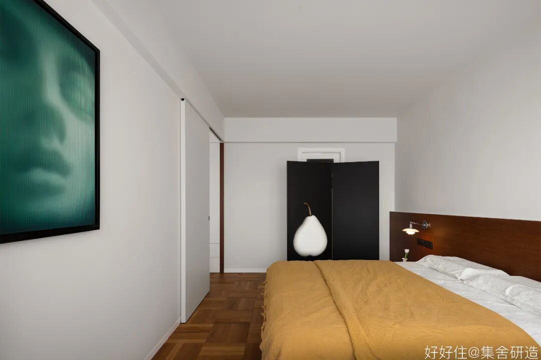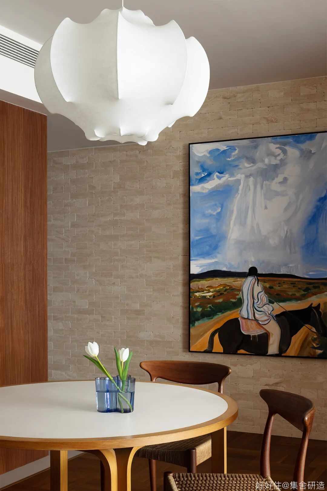 木制窗框和围档打造出这个家温润复古的氛围基调。为了更好实现「生活感」与「复古气质」的平衡,设计师@集舍研造 还选择了有质感的柚木、洞石砖墙搭配二十世纪的中古家具(文末附单品目录),把控不同材质和工艺间的尺度,让空间的每个角落都真实且生动。