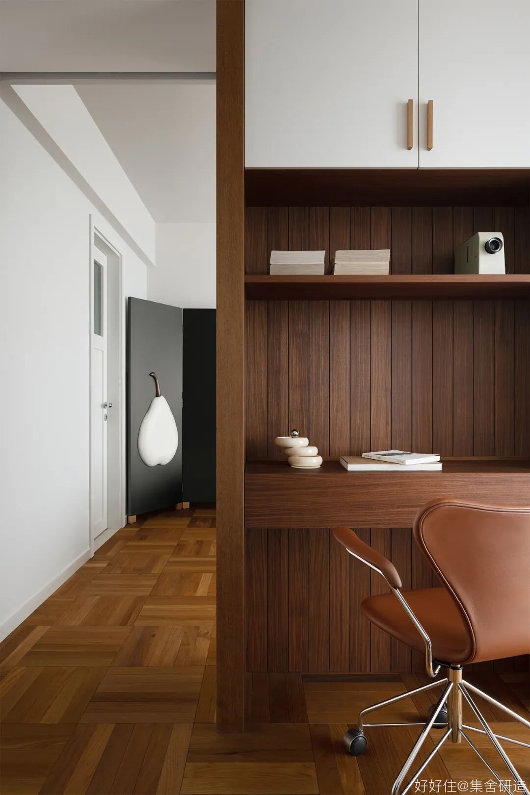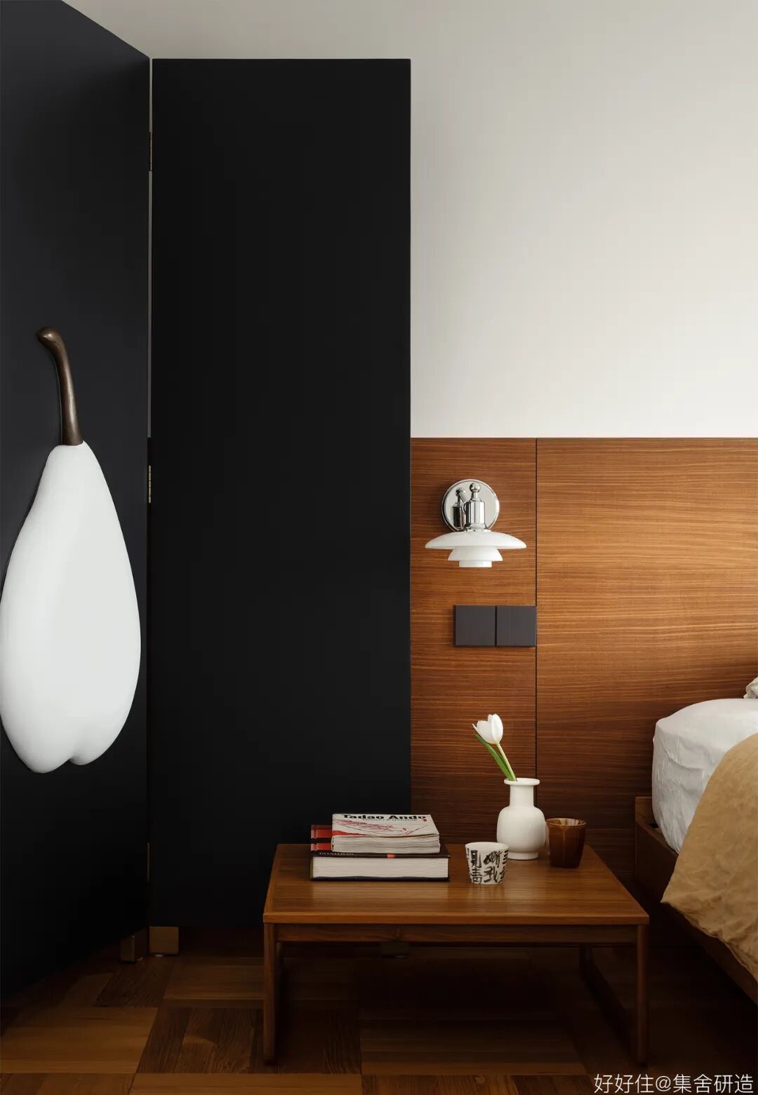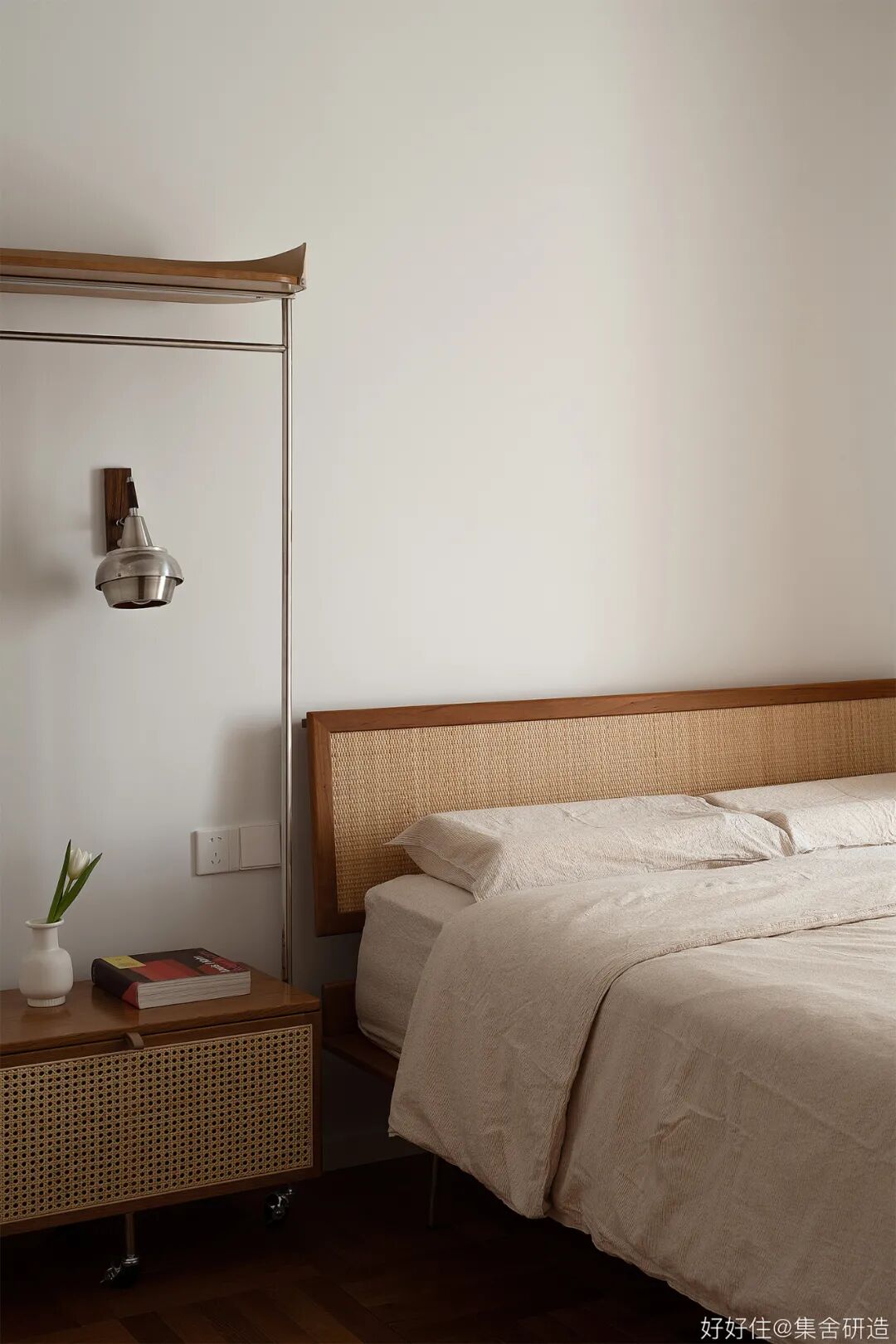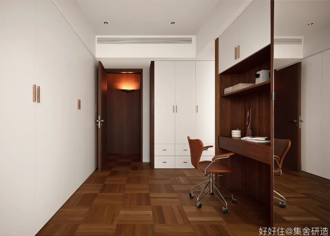 木制窗框和围档打造出这个家温润复古的氛围基调。为了更好实现「生活感」与「复古气质」的平衡,设计师@集舍研造 还选择了有质感的柚木、洞石砖墙搭配二十世纪的中古家具(文末附单品目录),把控不同材质和工艺间的尺度,让空间的每个角落都真实且生动。