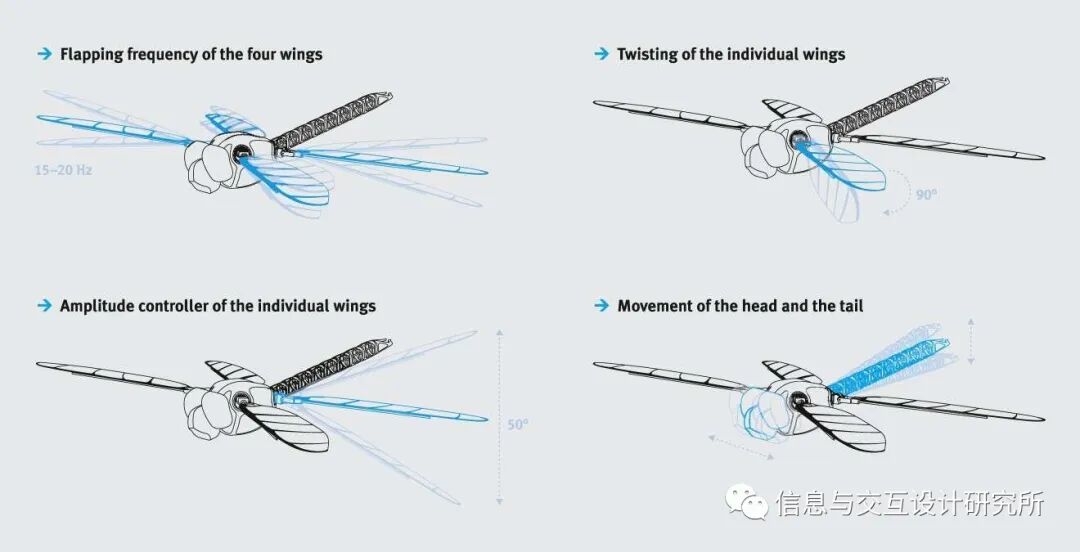 除了控制拍动频率和单个翅膀的旋转,还可控制四个翅膀中每一个的振幅。转动翅膀决定了推力的方向。振幅控制用于调节推力的大小。与智能手机的控制相结合,人造蜻蜓几乎可以到达任何空间角落。