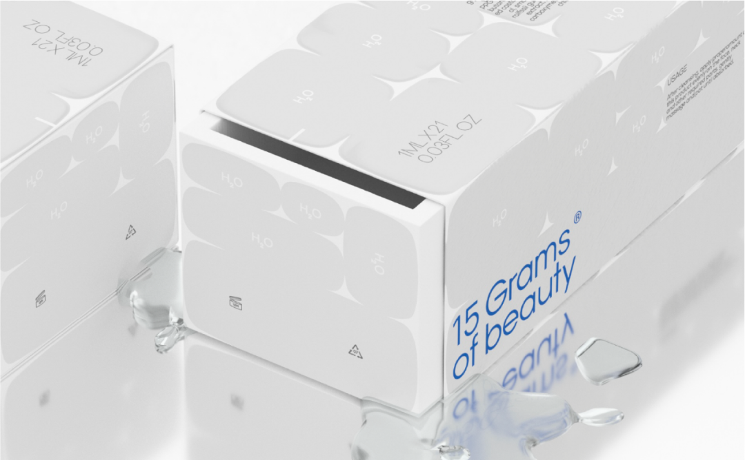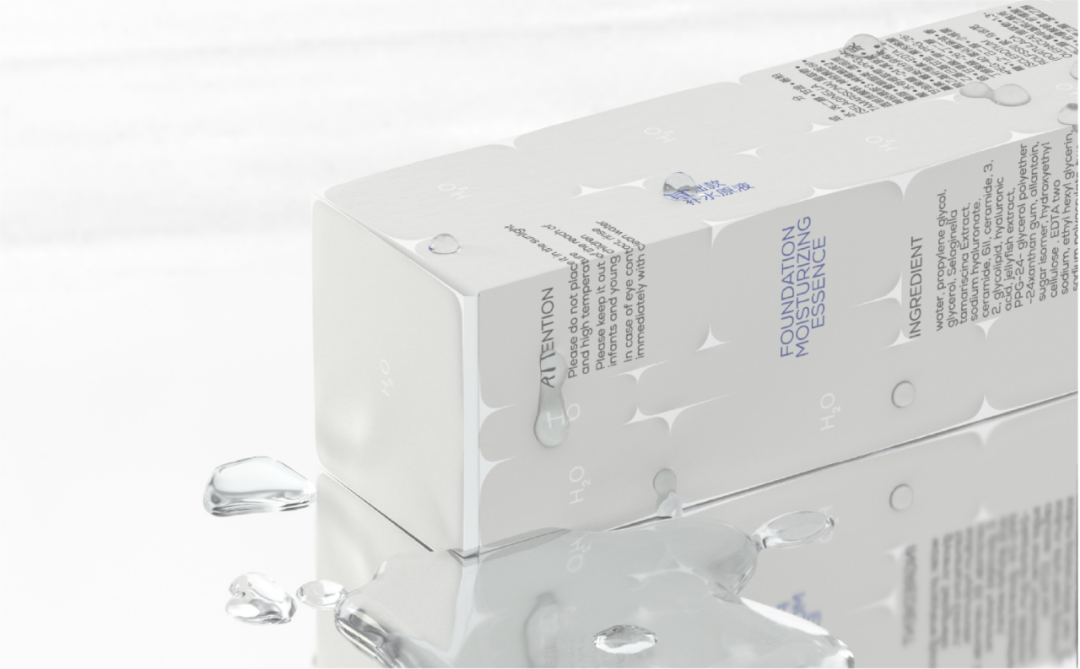在包装设计上我们运用了充盈胀满的水元素来作为视觉语言主体,水元素的边缘所形成的网格系统承载了放置文字信息这一功能。意在能够均匀的将这些大大小小的字体黑色块放置在包装的各个面,均匀整体画面。我们希望能够打造出一种拥有设计美感且处于商业语境下的护肤产品。